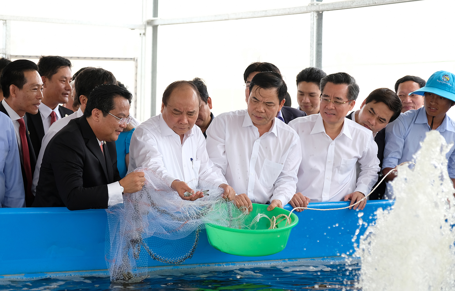Thủ tướng Nguyễn Xuân Phúc thăm Khu nông nghiệp ứng dụng công nghệ cao tôm Bạc Liêu, ngày 30/1/2018. |