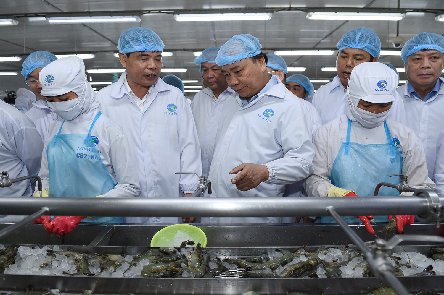 Thủ tướng Nguyễn Xuân Phúc tới thăm một cơ sở chế biến tôm tại địa bàn tỉnh Cà Mau, ngày 5/2/2017. |
