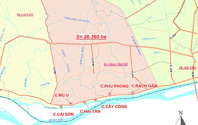 Dự án 6 cống tại đầu các kênh, rạch thông ra sông Tiền, nằm trên đường tỉnh 864. Sáu cống gồm Rạch Gầm, Phú Phong, Mù U (Châu Thành) và Cây Còng, Cái Sơn, Hai Tân (Cai Lậy).