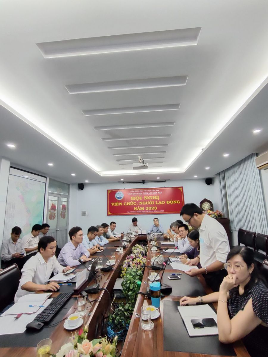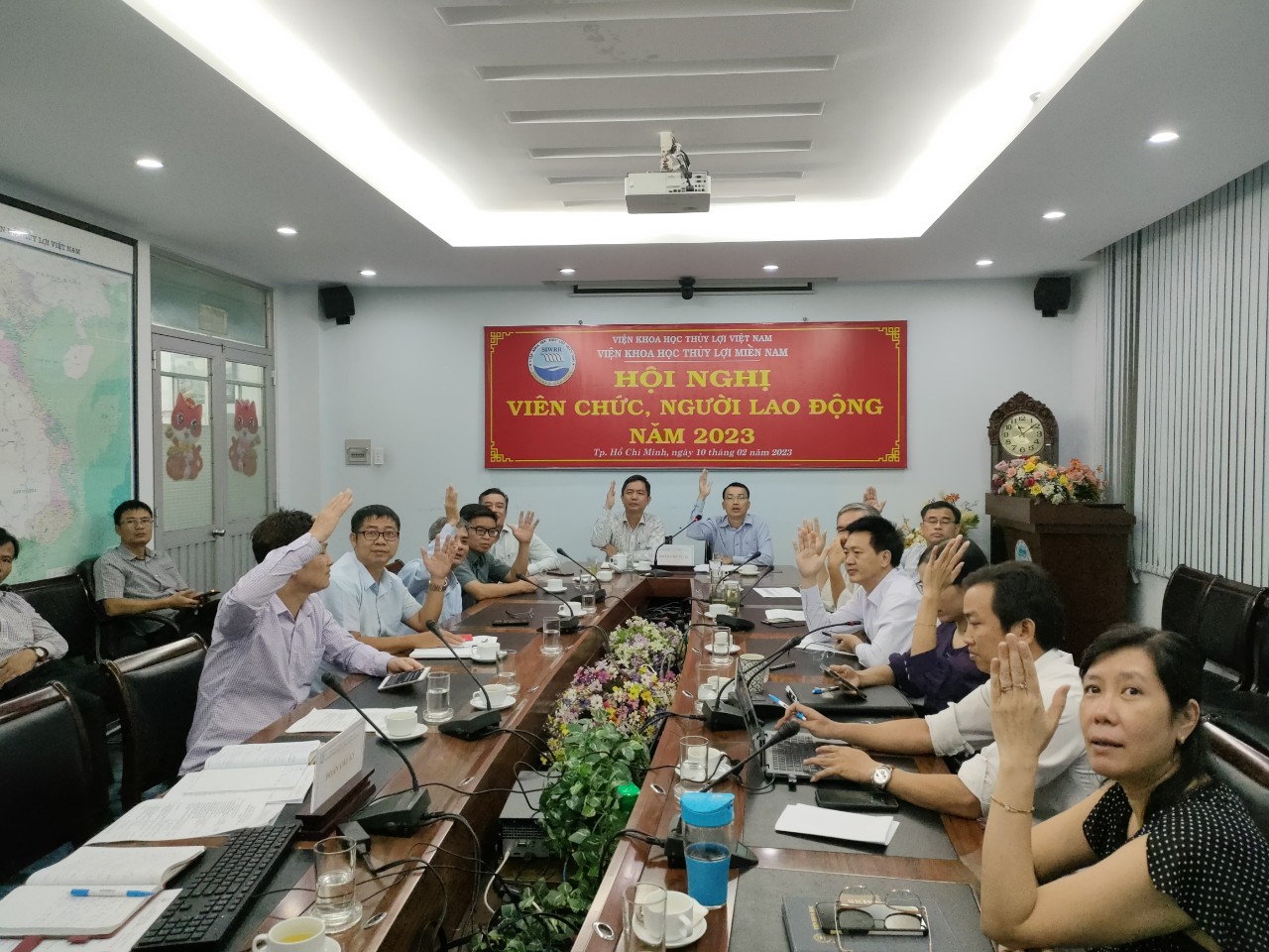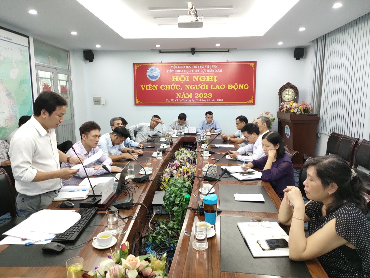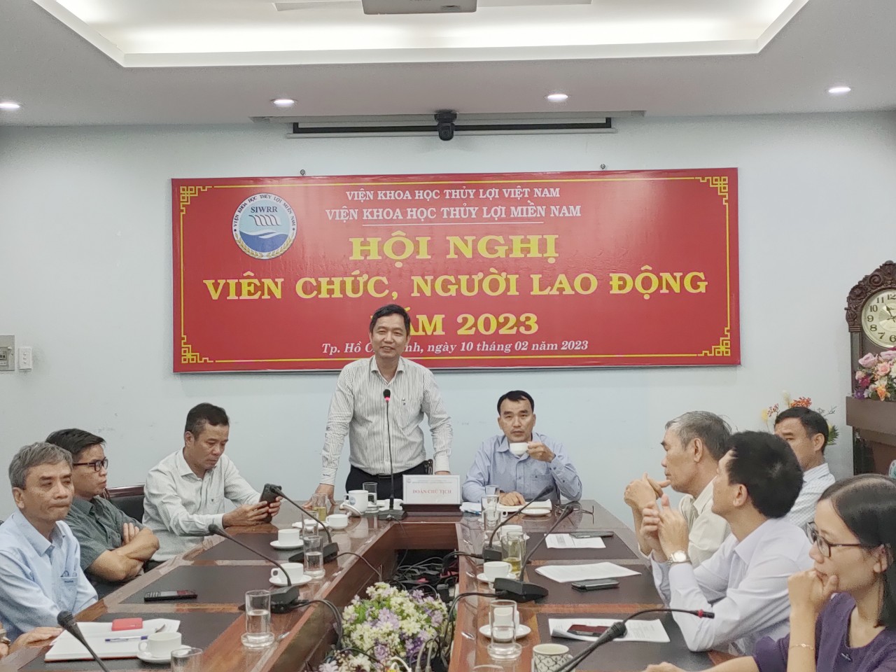Ông Đỗ Đắc Hải thay mặt đoàn chủ tịch báo cáo tóm tắt đánh giá việc thực hiện Nghị quyết của Hội nghị Viên chức, Người lao động của Viện năm 2022 và Dự thảo Nghị quyết Hội nghị Viên chức, Người lao động năm 2023: Trong năm 2022 Viện đã triển khai và hoàn thành tốt các đề tài, dự án các cấp và dự án HTQT. Viện được giao thực hiện tổng cộng 10 đề tài cấp Quốc gia (trong đó có 7 đề tài ở giai đoạn trước, 03 đề tài mở mới từ 2021 đến nay), đang thực hiện 03 dự án hợp tác quốc tế, đã mở mới 01 đề tài cấp thiết địa phương tỉnh Bến Tre, 2 đề tài cấp tỉnh, thành phố cho kế hoạch 2023 (tại tỉnh Đồng Nai và Tp. Hồ Chí Minh). Viện tiếp tục triển khai xây dựng tòa nhà Trung tâm dự báo chuyên ngành thuộc Tiểu dự án HP1-5: “Tăng cường năng lực dự báo chuyên ngành phục vụ quản lý vận hành các công trình thuỷ lợi ở Đồng bằng sông Cửu Long (HP1-5), dự án ICRSL” tại khu nhà B. Viện đã triển khai xong giai đoạn lập thiết kế bản vẽ thi công – dự toán, lựa chọn nhà thầu xây lắp, giám sát và khởi công xây dựng tòa nhà Dự án tăng cường năng lực nghiên cứu và làm việc cho Viện Khoa học Thủy lợi miền Nam. Viện đã hoàn thành công tác mua sắm thiết bị phục vụ các phòng thí nghiệm năm 2022. Viện đã tiến hành rà soát, bổ sung các chức danh lãnh đạo quản lý giai đoạn 2021 – 2026 và thực hiện công tác quy hoạch lần đầu giai đoạn theo đúng quy định. Viện luôn đảm bảo chế độ chính sách, phúc lợi cho cán bộ, viên chức, người lao động. Với những thành tích đạt được, năm 2022 Viện đã được đạt được nhiều danh hiệu thi đua, khen thưởng như: Cờ thi đua bộ Cờ thi đua bộ Bộ Nông nghiệp và PTNT; 08 đơn vị đạt Danh hiệu Tập thể lao động xuất sắc; 04 đơn vị thuộc Viện có Giấy khen Giám đốc Viện VKHTLVN; 03 đơn vị được bằng khen cấp Bộ; 04 Sáng kiến cấp Bộ; 02 Sáng kiến cấp toàn quốc; 01 Huân chương Lao động hạng 3 cho cá nhân; 06 cán bộ được bằng khen cấp Bộ. 15 cán bộ nhận Giấy khen của Giám đốc Viện Khoa học Thủy lợi Việt Nam.
