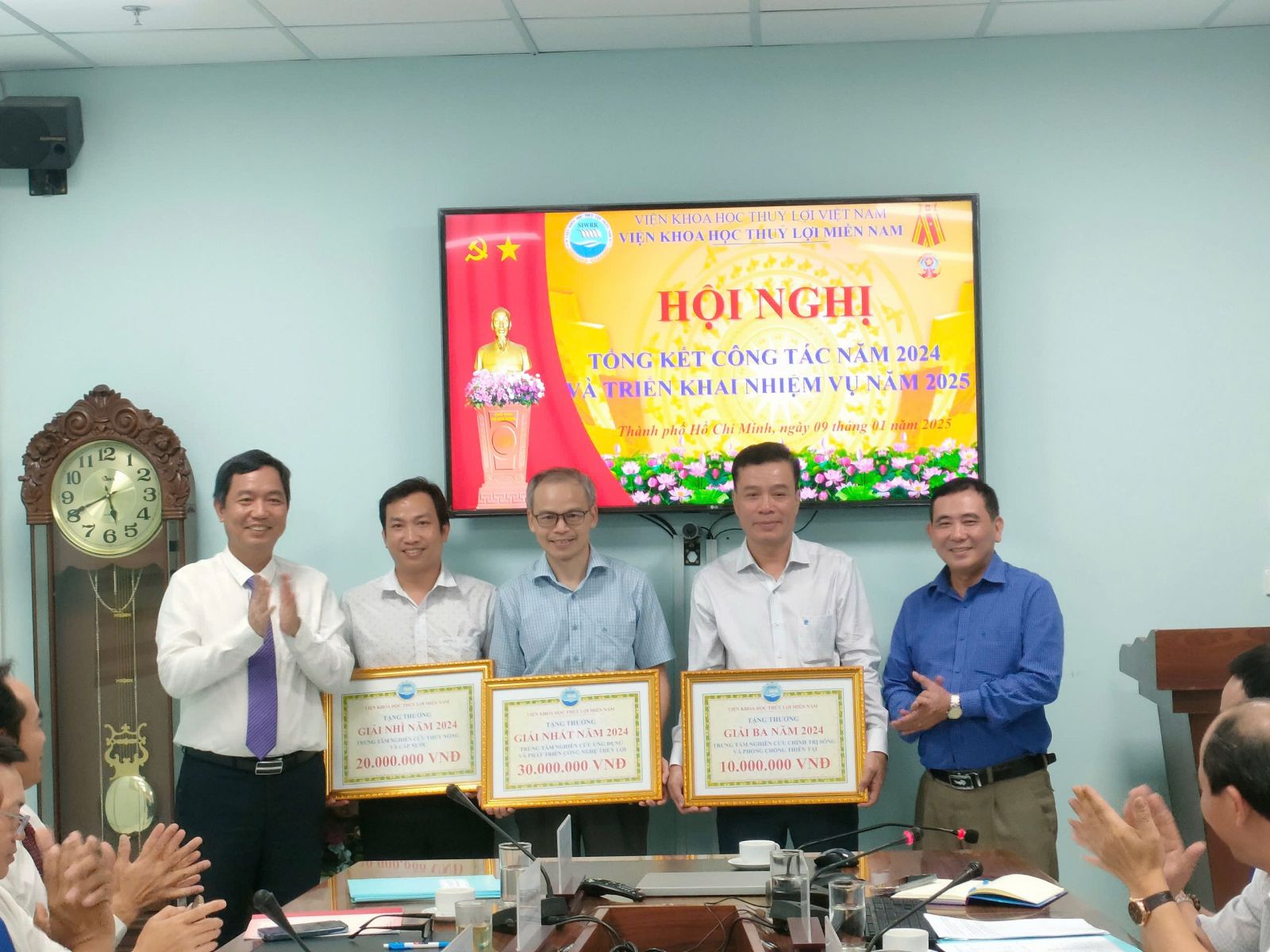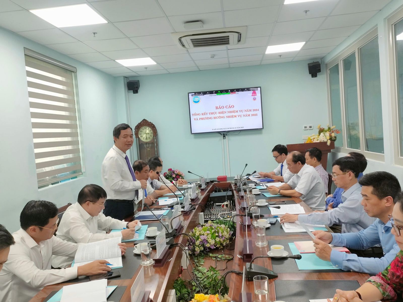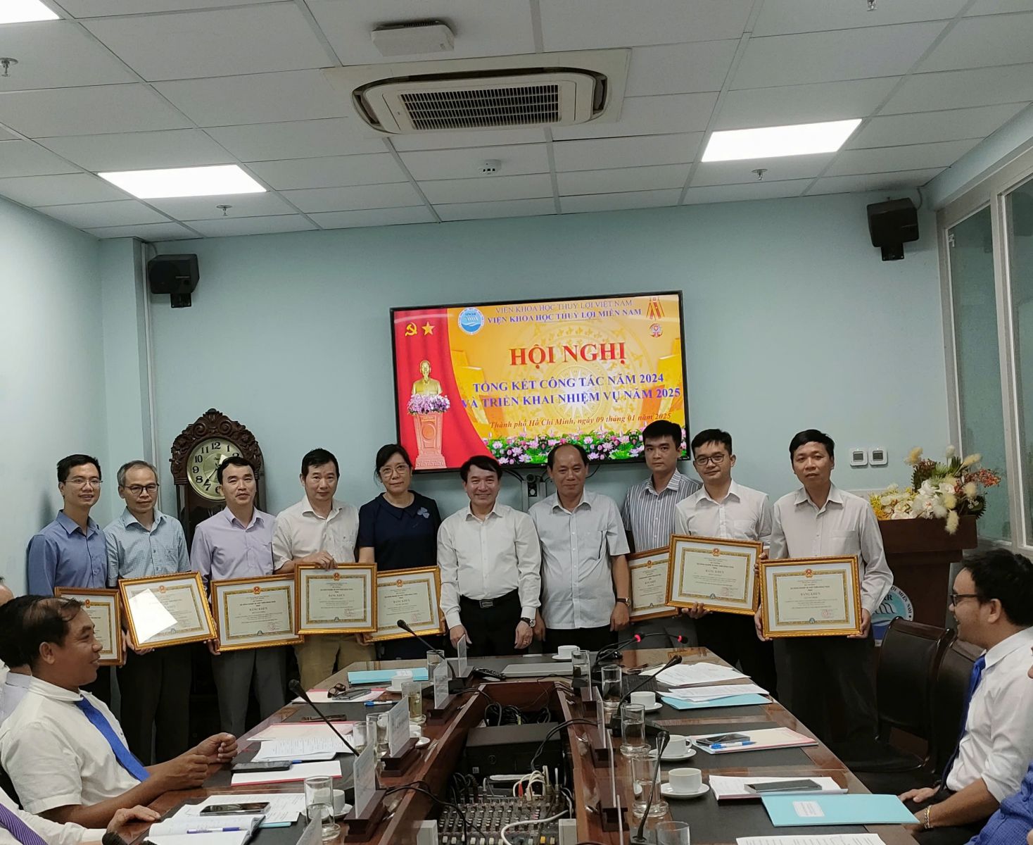 Báo cáo tổng kết công tác của Viện do Viện trưởng Trần Bá Hoằng trình bày cho biết năm 2024 Viện đã và đang thực hiện 2 đề tài cấp Quốc gia, ngoài ra đã mở mới trong năm thêm được 3 đề tài thuộc KC08/21-30, 5 đề tài cấp Bộ (mở mới trong năm được 1 đề tài cấp Bộ), 5 đề tài cấp tỉnh; 02 Nhiệm vụ Xây dựng Tiêu chuẩn Quốc gia; 2 nhiệm vụ dịch vụ sự nghiệp công và 2 dự án ĐTCB cùng với hàng trăm công trình, dự án (chuyển tiếp và mới) phục vụ sản xuất nhằm thực hiện nhiệm vụ chính trị của ngành và các địa phương trong địa bàn hoạt động của Viện được giao ở khu vực phía Nam, các đề tài triển khai đều đáp ứng được yêu cầu chất lượng nội dung sản phẩm theo đặt hàng. Ngoài ra Viện còn thực hiện các nhiệm vụ đột xuất khác mà Bộ Nông nghiệp và PTNT, Cục Thủy lợi, Cục Quản lý đê điều và PCTT, Viện Khoa học Thủy lợi Việt Nam giao điển hình như các nhiệm vụ theo dõi, dự báo tình hình hạn hán, xâm nhập mặn hay tình hình sạt lở bờ sông, bờ biển,.... Viện đã có nhiều công trình nghiên cứu, ứng dụng thiết thực phục vụ phòng chống lụt bão, giảm nhẹ thiên tai; phục vụ nông nghiệp và phát triển nông thôn; phục vụ xây dựng, bảo vệ công trình thủy lợi, thủy điện ở các tỉnh phía Nam.