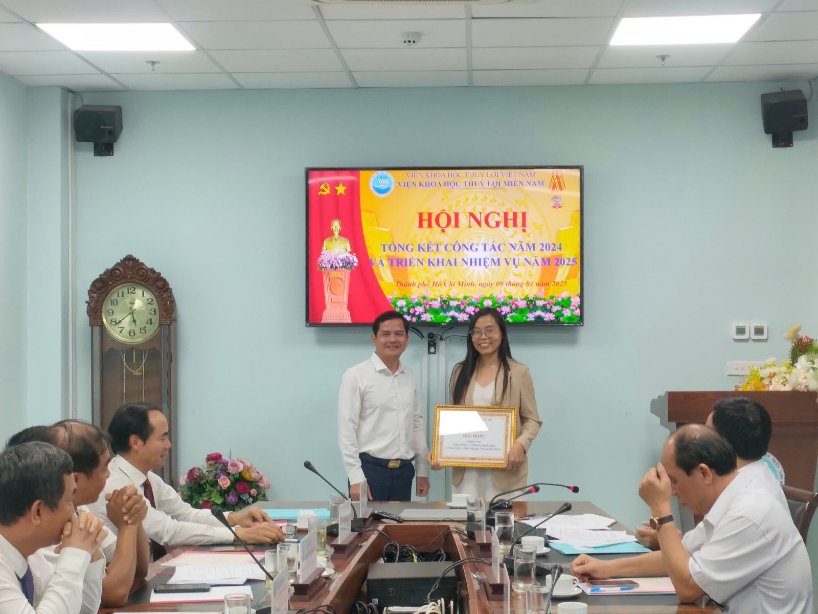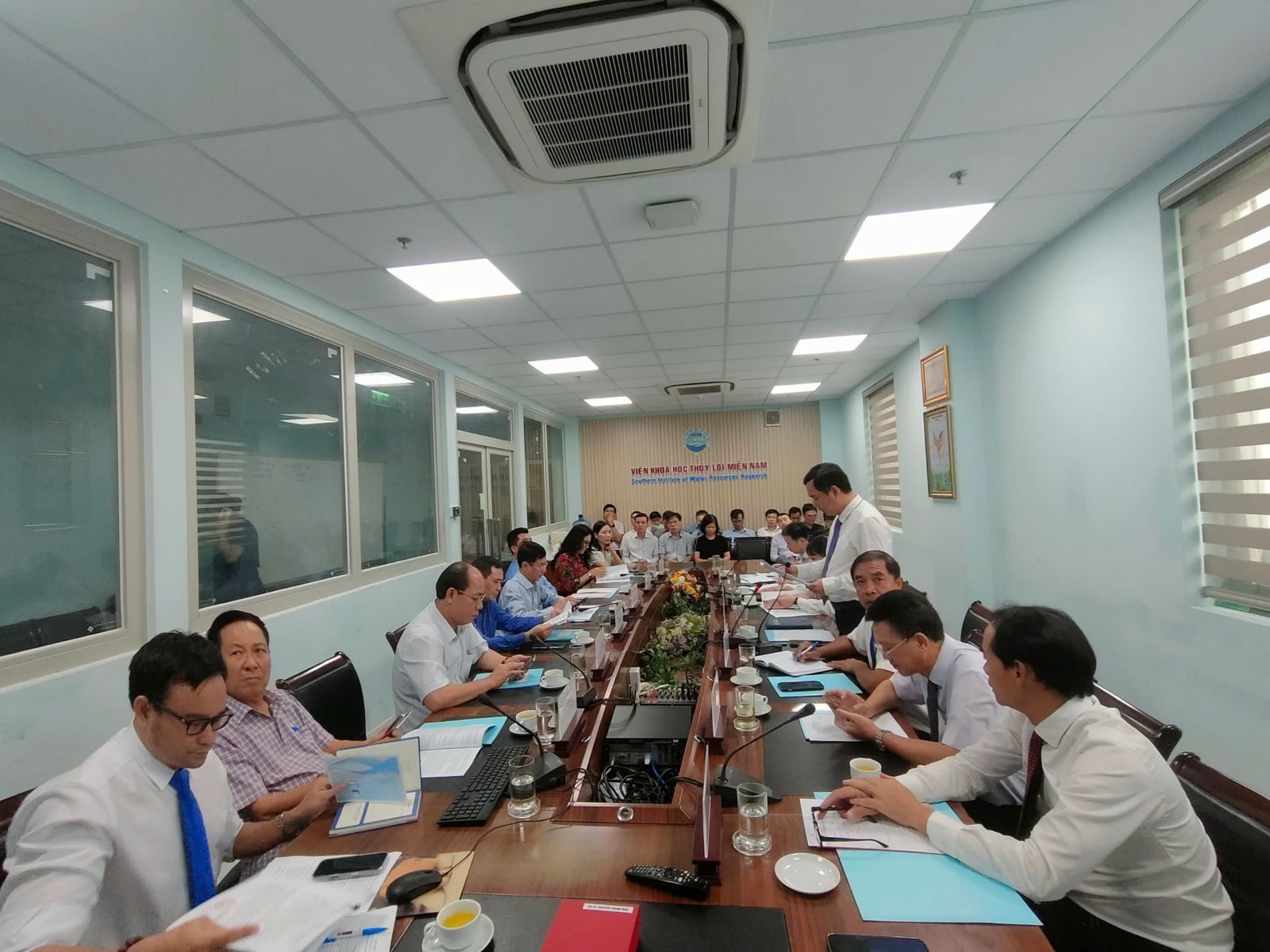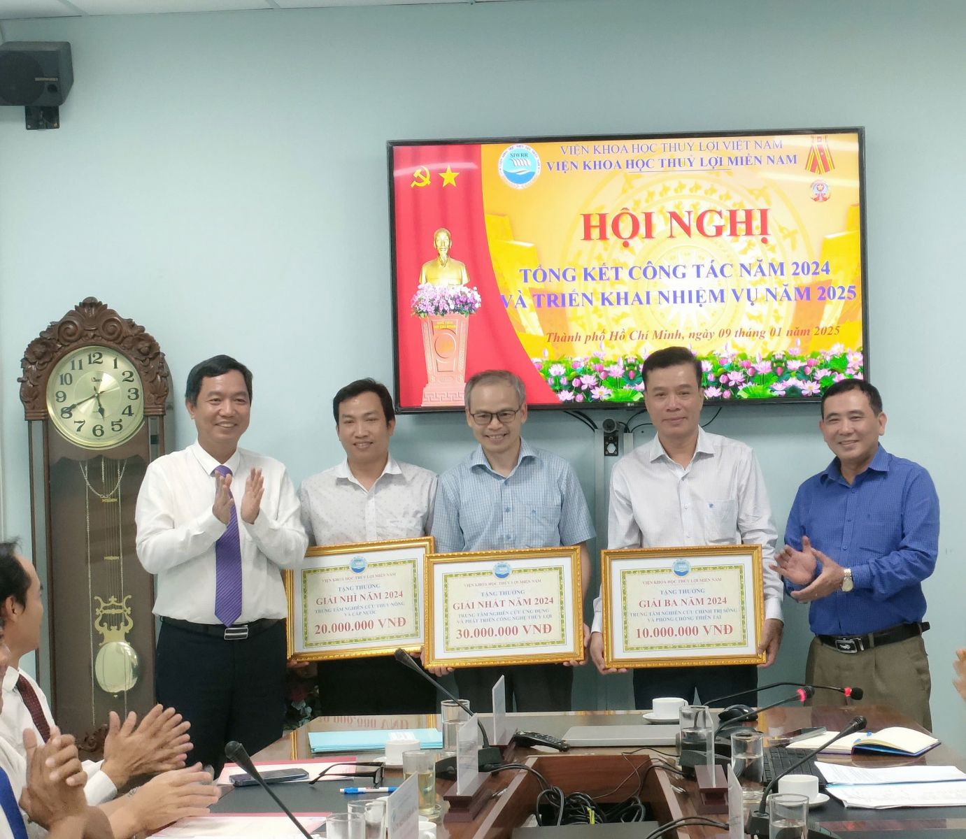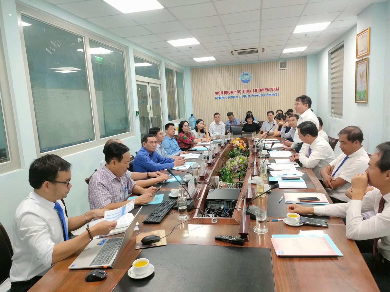 Báo cáo tổng kết công tác của Viện do Viện trưởng Trần Bá Hoằng trình bày cho biết năm 2024 Viện đã và đang thực hiện 2 đề tài cấp Quốc gia, ngoài ra đã mở mới trong năm thêm được 3 đề tài thuộc KC08/21-30, 5 đề tài cấp Bộ (mở mới trong năm được 1 đề tài cấp Bộ), 5 đề tài cấp tỉnh; 02 Nhiệm vụ Xây dựng Tiêu chuẩn Quốc gia; 2 nhiệm vụ dịch vụ sự nghiệp công và 2 dự án ĐTCB cùng với hàng trăm công trình, dự án (chuyển tiếp và mới) phục vụ sản xuất nhằm thực hiện nhiệm vụ chính trị của ngành và các địa phương trong địa bàn hoạt động của Viện được giao ở khu vực phía Nam, các đề tài triển khai đều đáp ứng được yêu cầu chất lượng nội dung sản phẩm theo đặt hàng. Ngoài ra Viện còn thực hiện các nhiệm vụ đột xuất khác mà Bộ Nông nghiệp và PTNT, Cục Thủy lợi, Cục Quản lý đê điều và PCTT, Viện Khoa học Thủy lợi Việt Nam giao điển hình như các nhiệm vụ theo dõi, dự báo tình hình hạn hán, xâm nhập mặn hay tình hình sạt lở bờ sông, bờ biển,.... Viện đã có nhiều công trình nghiên cứu, ứng dụng thiết thực phục vụ phòng chống lụt bão, giảm nhẹ thiên tai; phục vụ nông nghiệp và phát triển nông thôn; phục vụ xây dựng, bảo vệ công trình thủy lợi, thủy điện ở các tỉnh phía Nam.