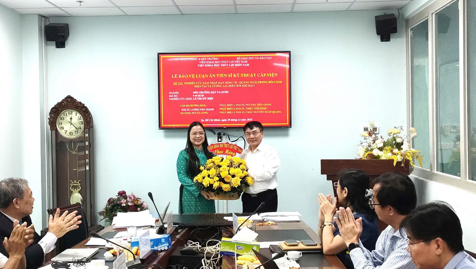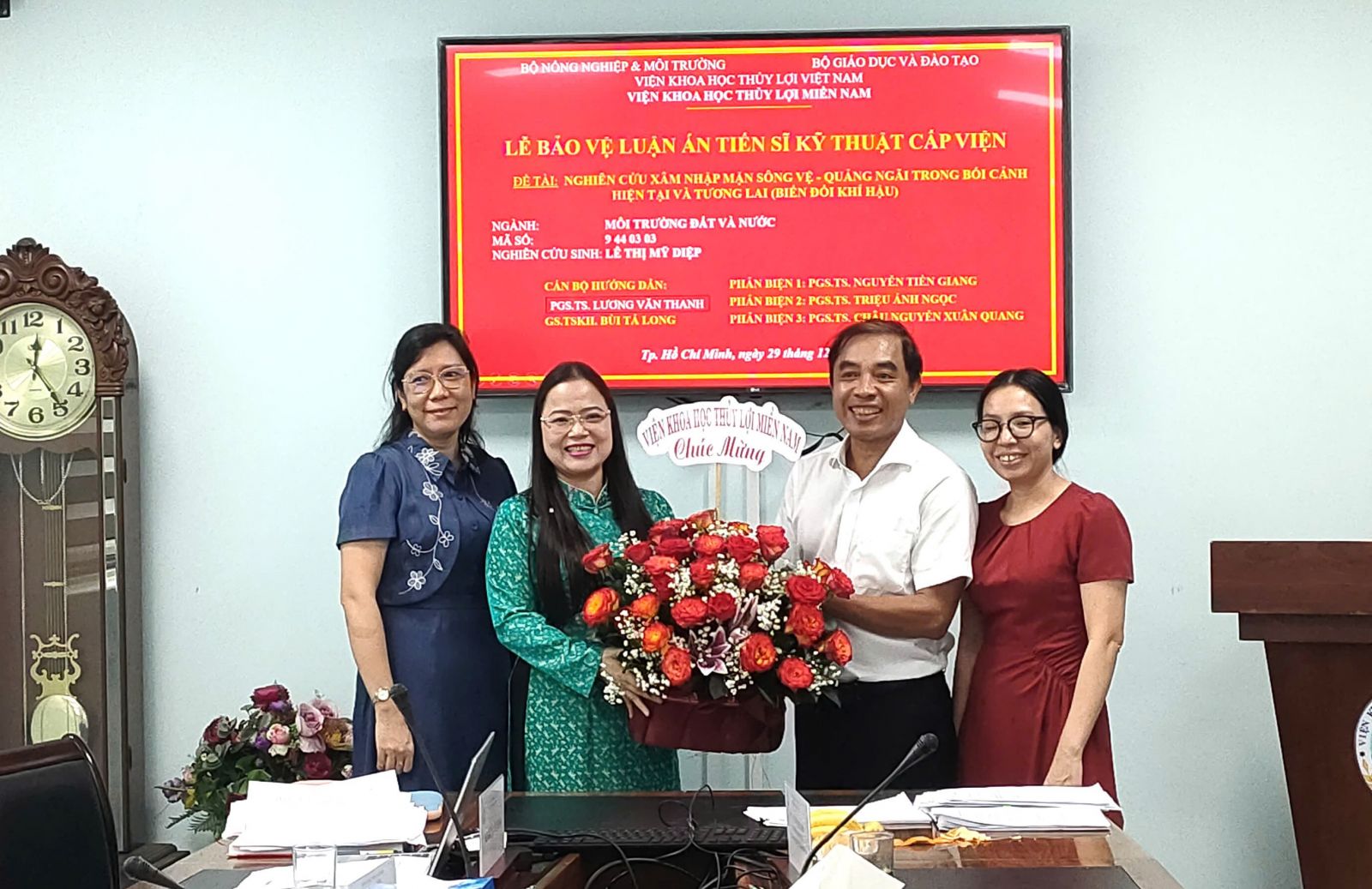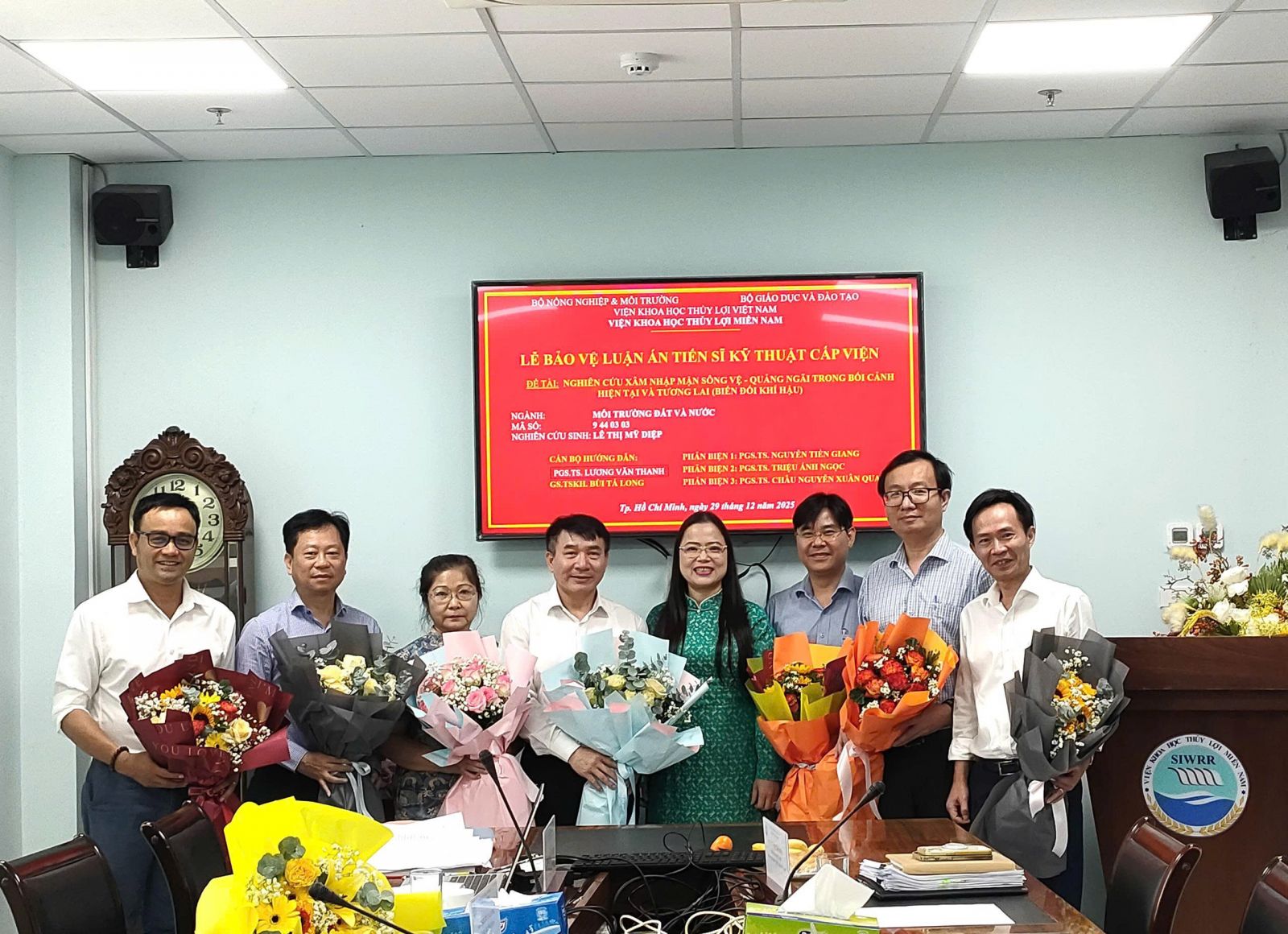 Ngày 29 tháng 12 năm 2025 Viện Khoa học Thủy lợi miền Nam đã tổ chức Lễ bảo vệ luận án tiến sĩ cấp Viện cho NCS Lê Thị Mỹ Diệp với tên đề tài: Nghiên cứu xâm nhập mặn sông Vệ - Quảng Ngãi trong bối cảnh hiện tại và tương lai (Biến đổi khí hậu); Ngành: Môi trường đất và nước; Mã số: 9 44 03 03