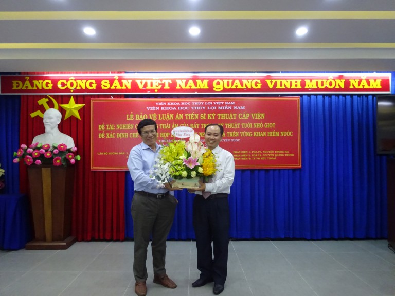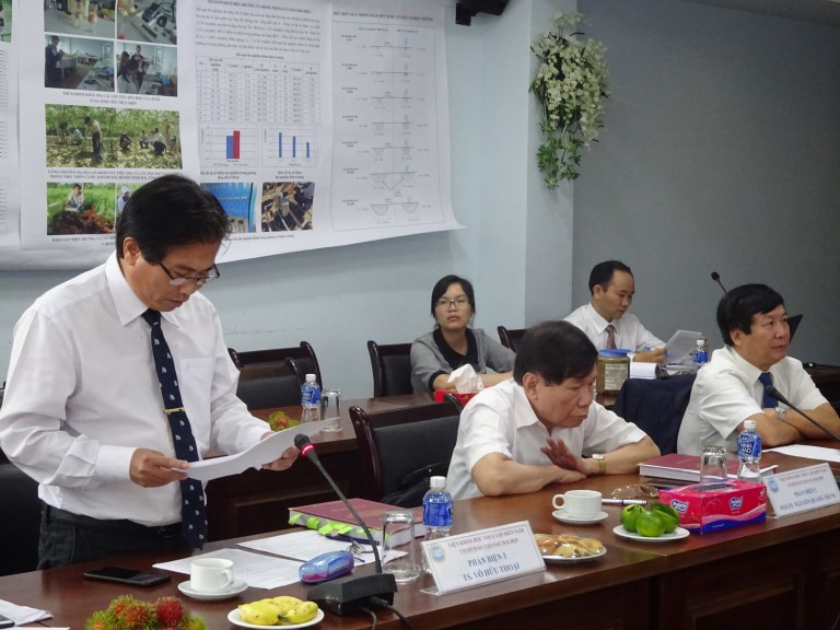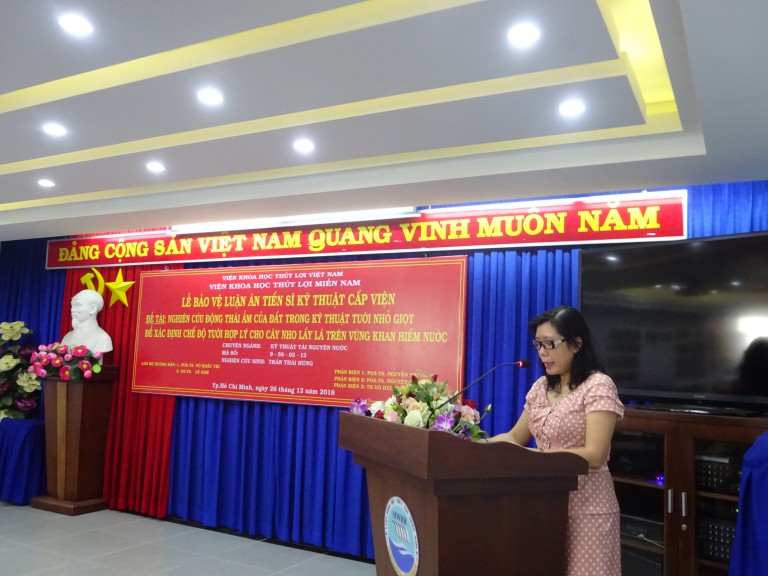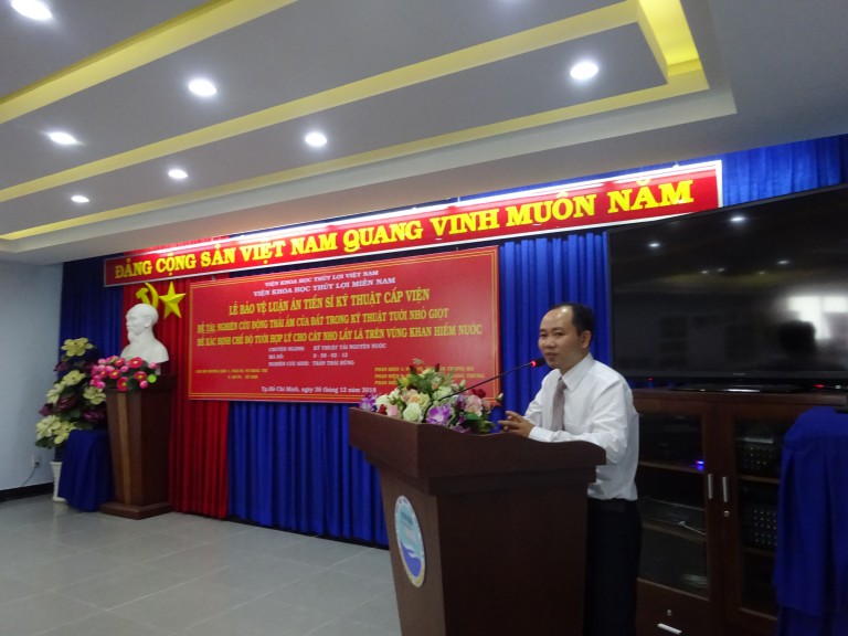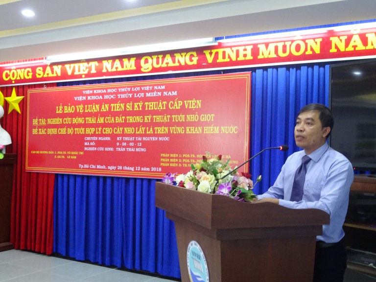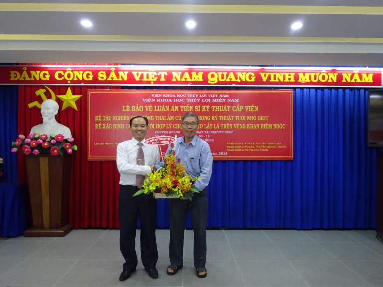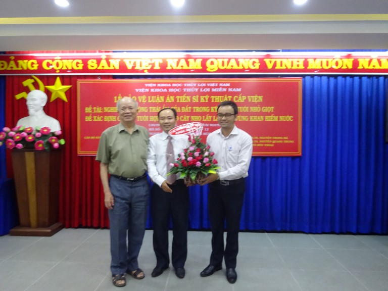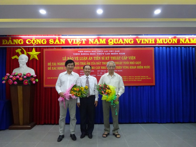 Hội đồng Đánh giá luận án chính thức (cấp Viện) được thành lập theo Quyết định số 682/QĐ-VKHTLVN ngày 27/9/2018 của Giám đốc Viện Khoa học Thủy lợi Việt Nam gồm 7 thành viên do GS.TS Tăng Đức Thắng (Viện Khoa học Thủy lợi Việt Nam) làm Chủ tịch Hội đồng; 3 Ủy viên phản biện là PGS.TS Nguyễn Trọng Hà (Đại học Thủy lợi); PGS.TS Nguyễn Quang Trung (Hội Thủy lợi Việt Nam), TS. Võ Hữu Thoại (Viện Cây ăn quả miền Nam). Thư ký khoa học của Hội đồng là PGS.TS Đỗ Tiến Lanh (Viện Khoa học Thủy lợi miền Nam).