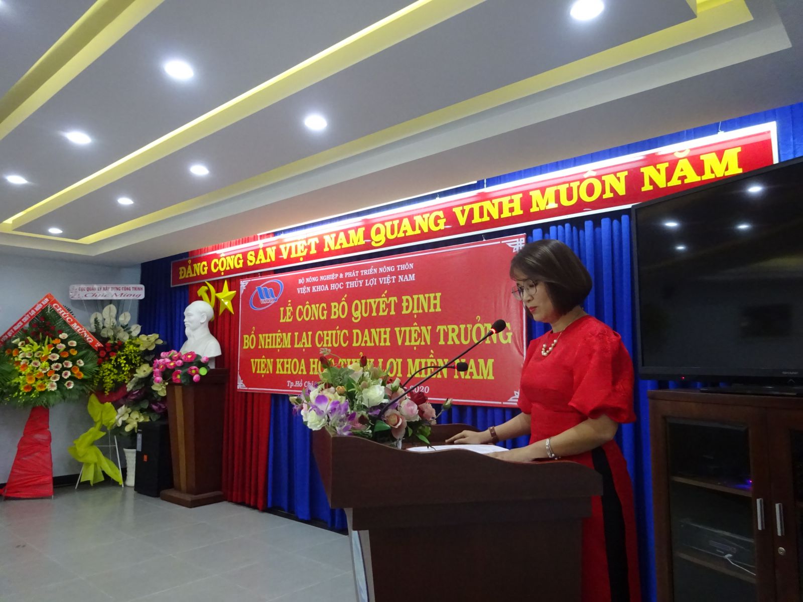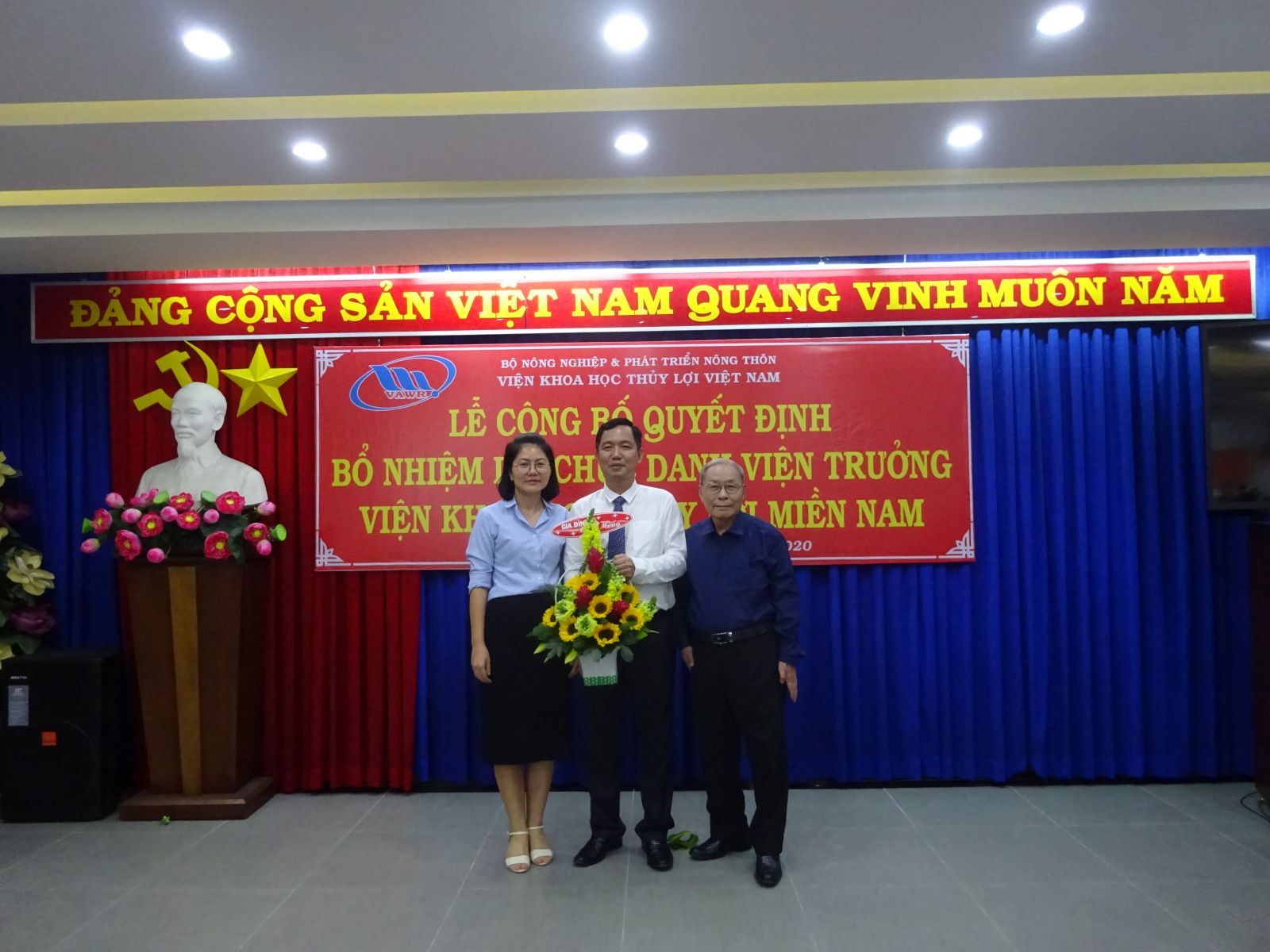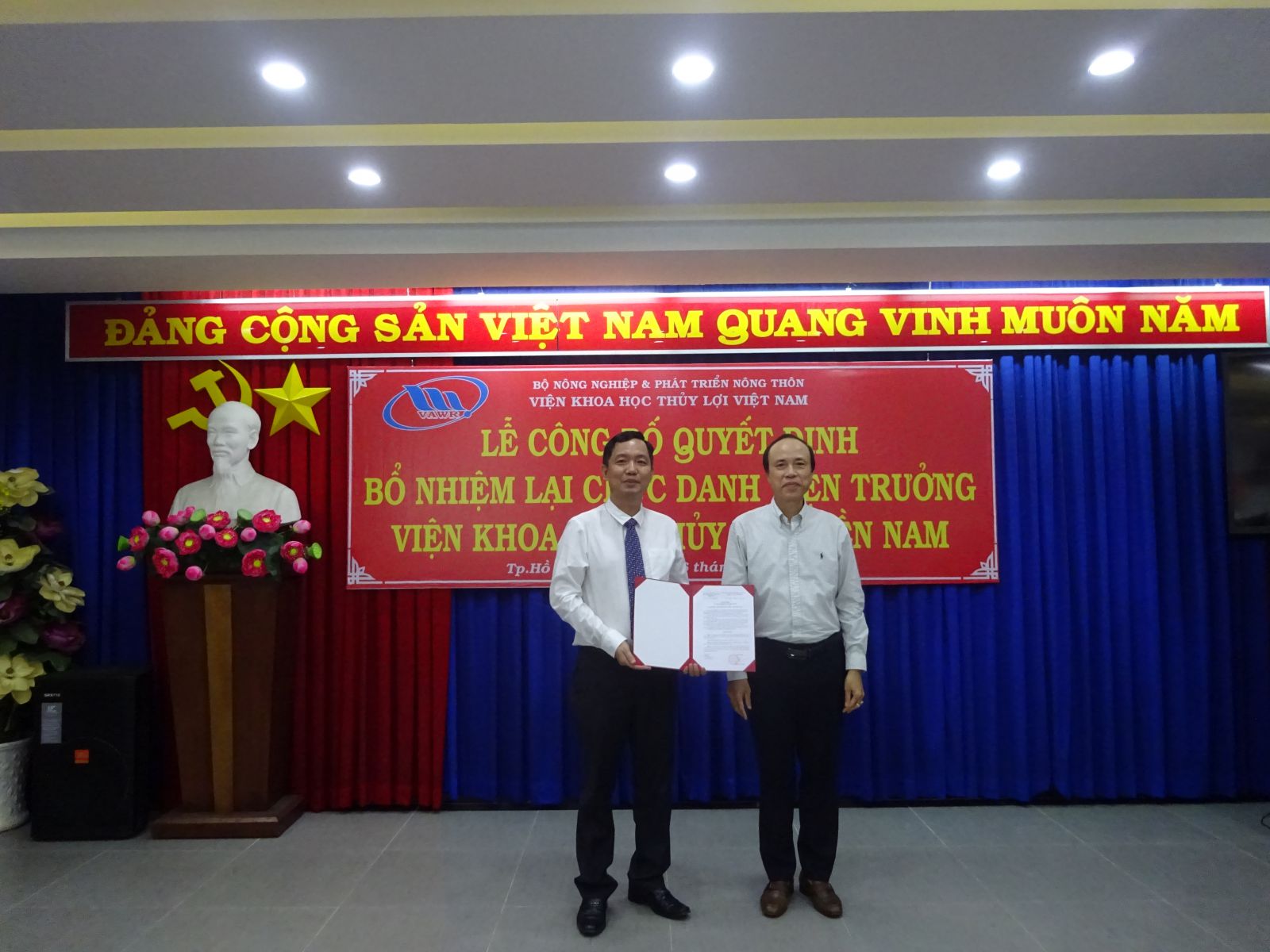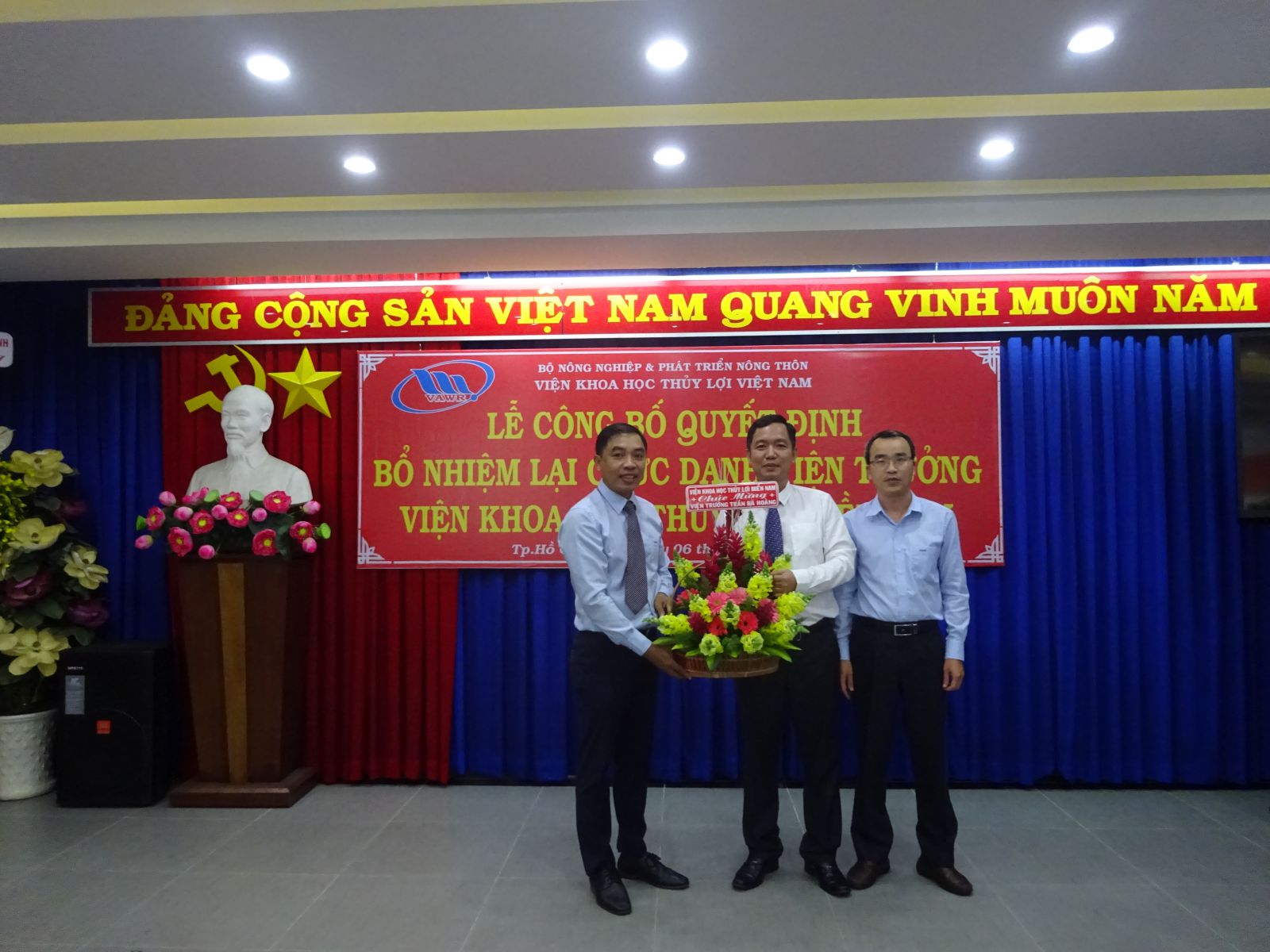 Tại buổi lễ, ThS. Nguyễn Thu Trang - Phó Trưởng Ban Tổ chức, Hành chính đã công bố Quyết định số 18/QĐ-VKHTLVN ngày 06/01/2020 của Giám đốc Viện Khoa học Thủy lợi Việt Nam về việc bổ nhiệm lại viên chức quản lý đối với PGS.TS. Trần Bá Hoằng Viện trưởng Viện Khoa học Thủy lợi miền Nam. Thời hạn bổ nhiệm là 05 năm kể từ ngày 12/01/2020.
