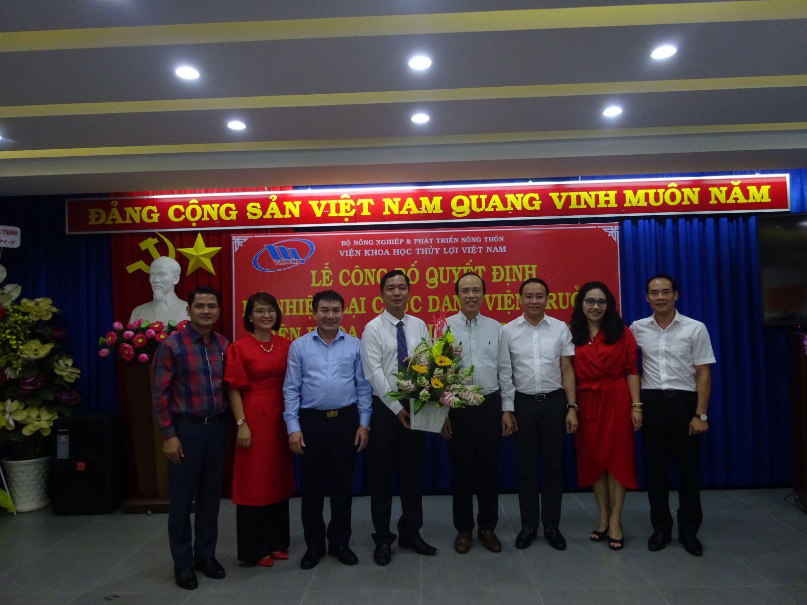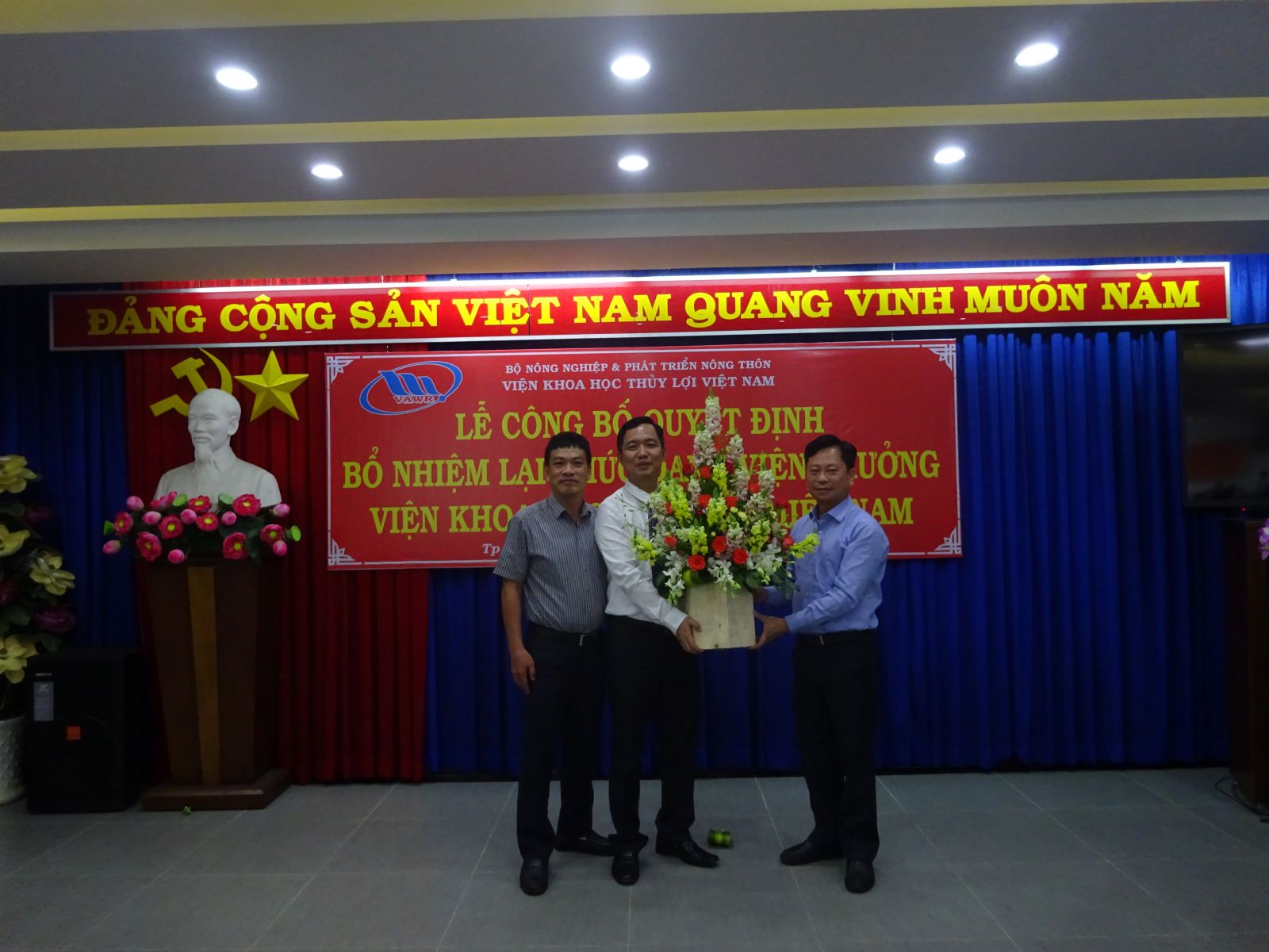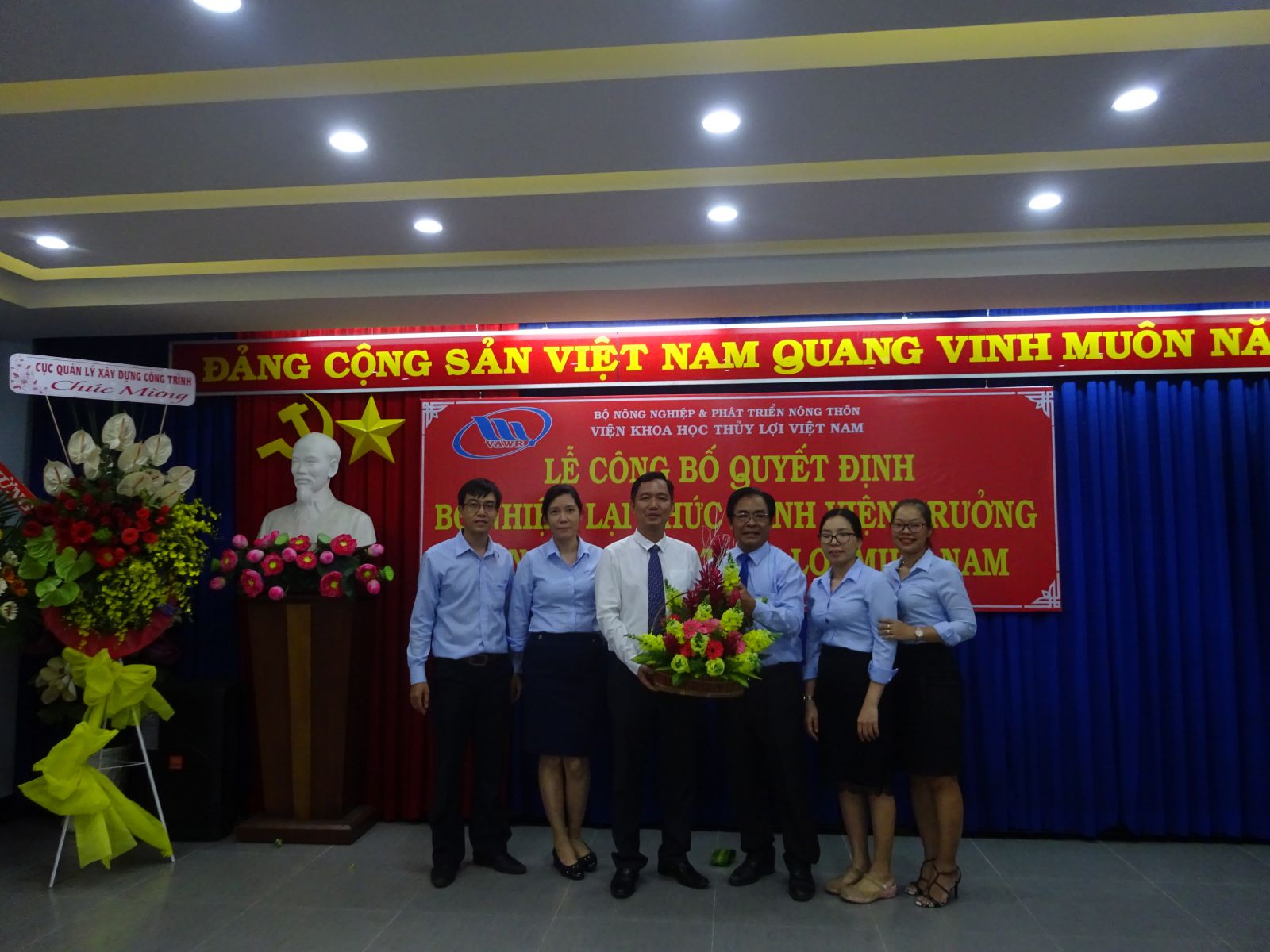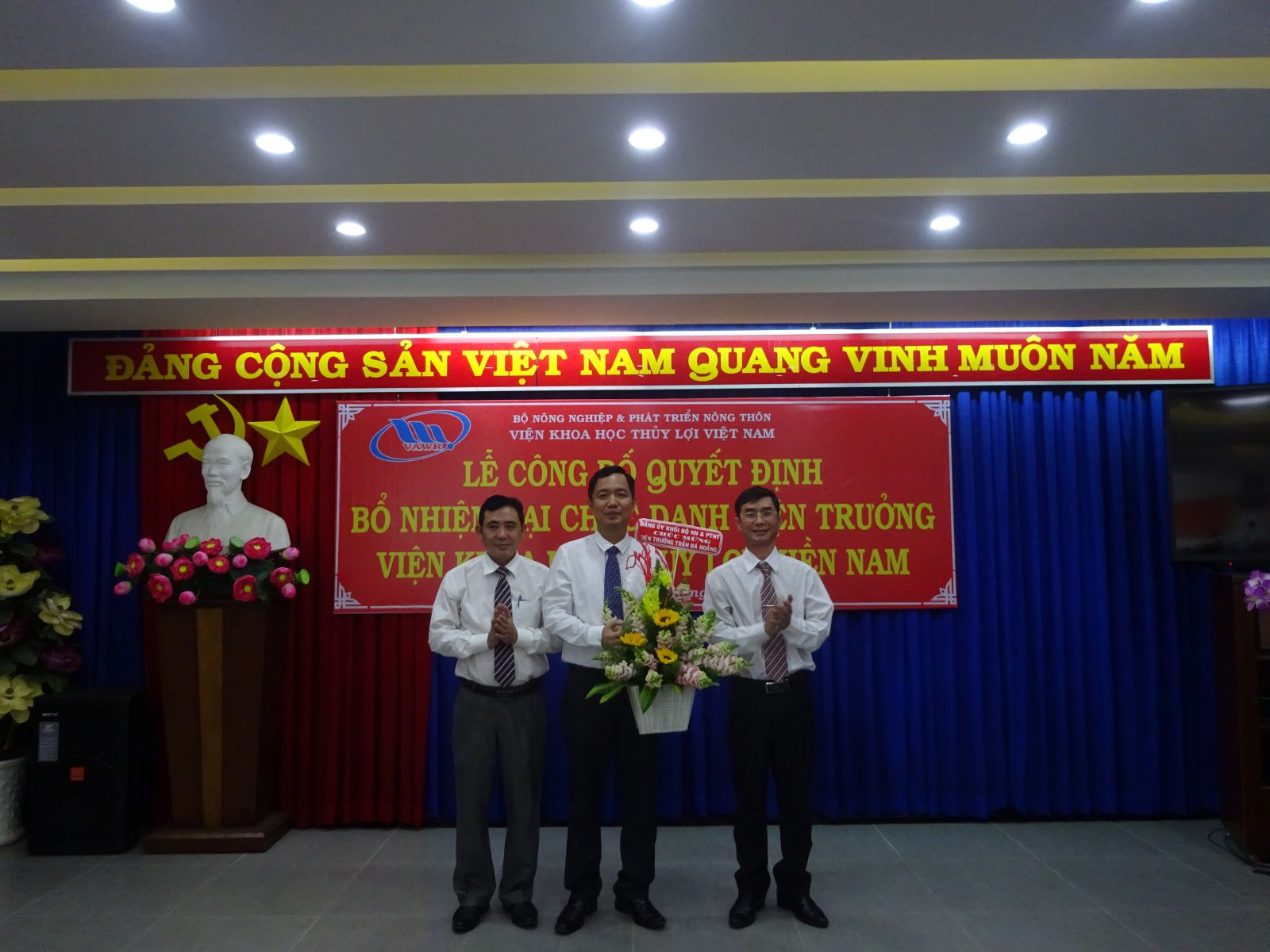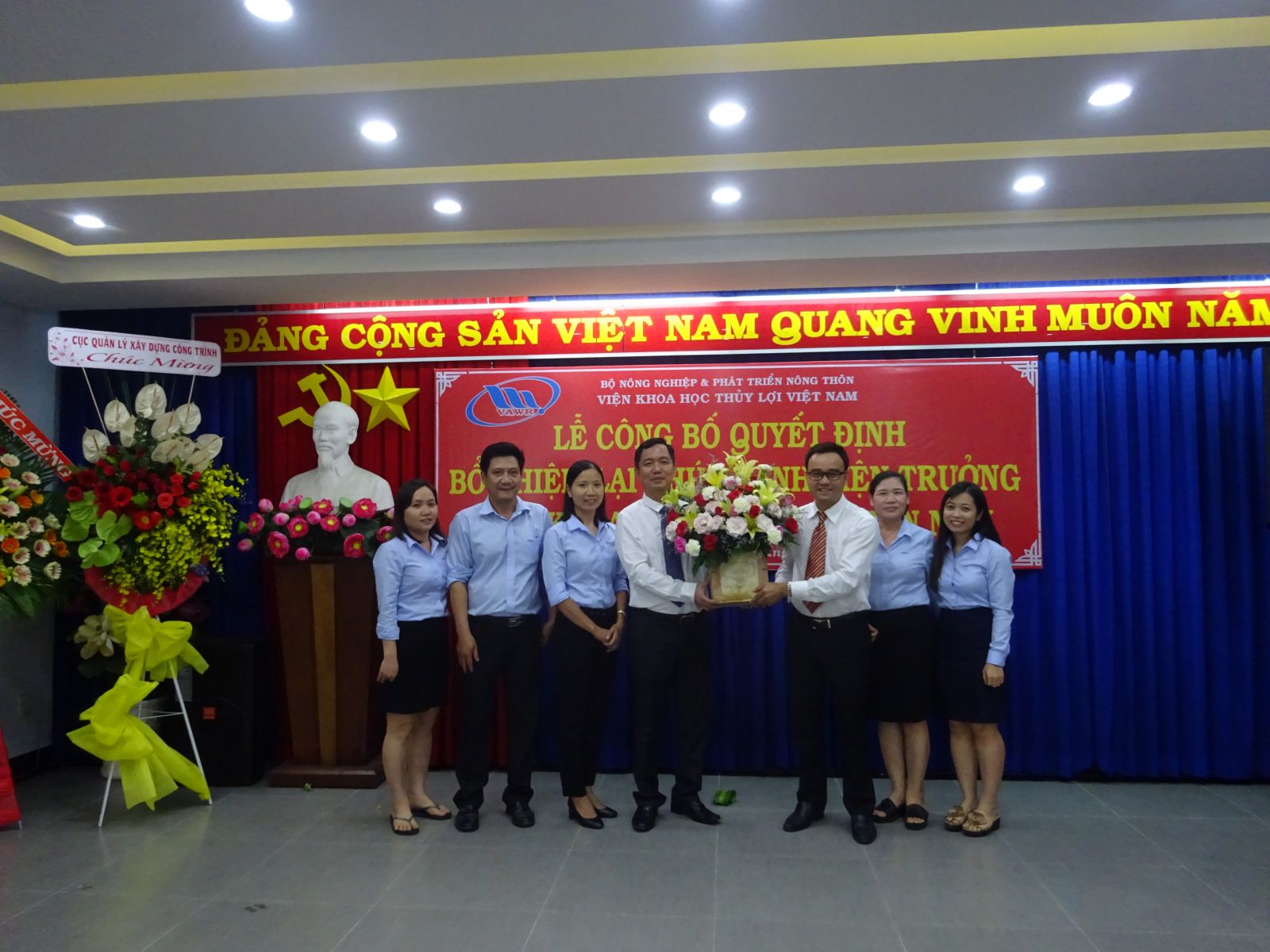Tại buổi lễ, ThS. Nguyễn Thu Trang - Phó Trưởng Ban Tổ chức, Hành chính đã công bố Quyết định số 18/QĐ-VKHTLVN ngày 06/01/2020 của Giám đốc Viện Khoa học Thủy lợi Việt Nam về việc bổ nhiệm lại viên chức quản lý đối với PGS.TS. Trần Bá Hoằng Viện trưởng Viện Khoa học Thủy lợi miền Nam. Thời hạn bổ nhiệm là 05 năm kể từ ngày 12/01/2020.