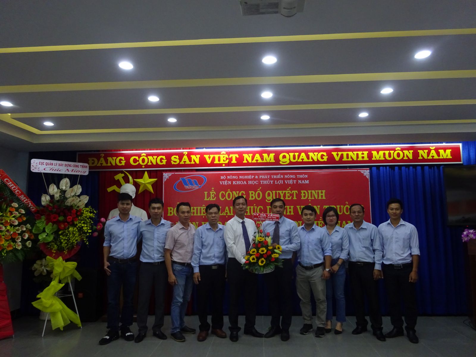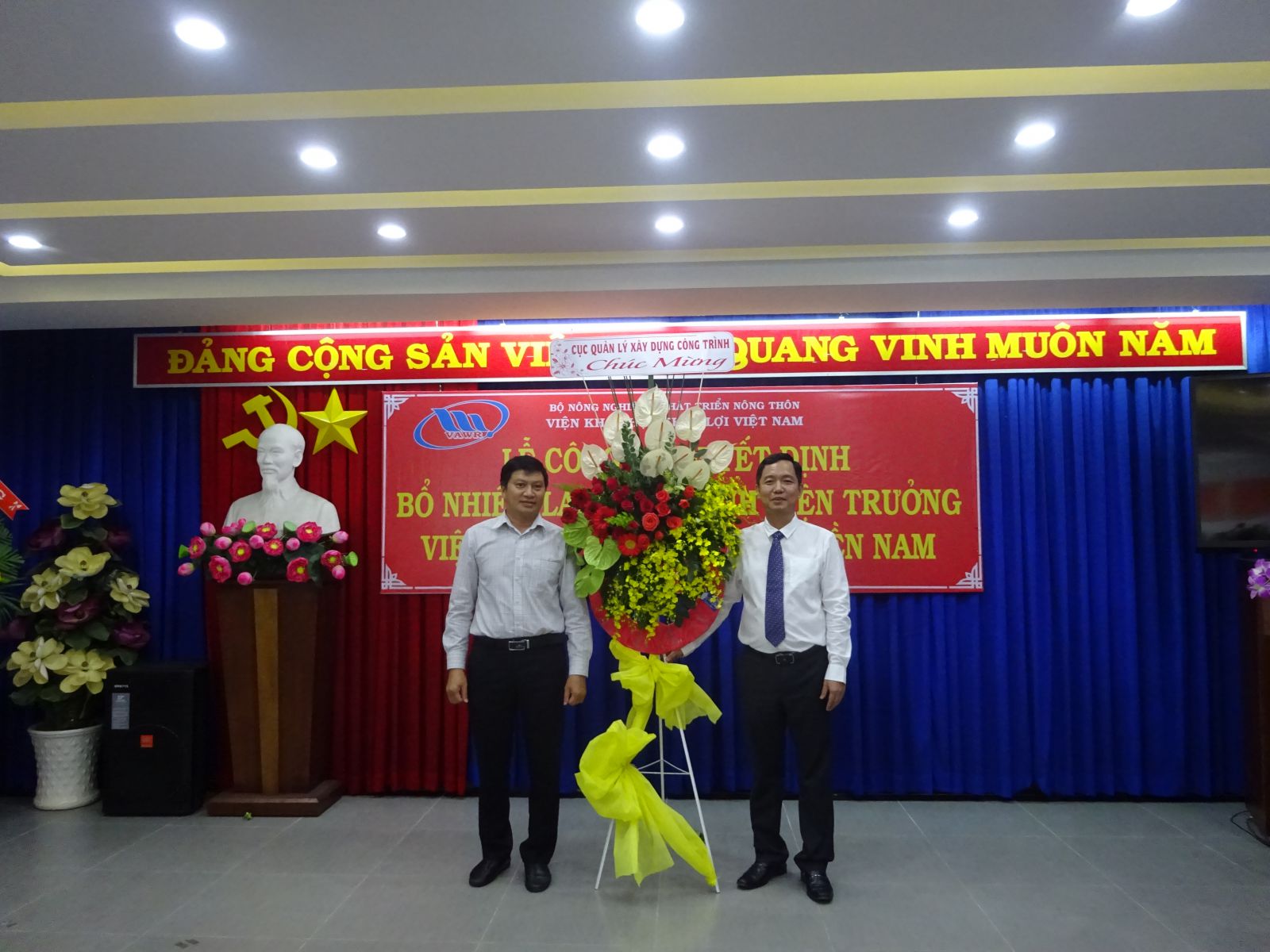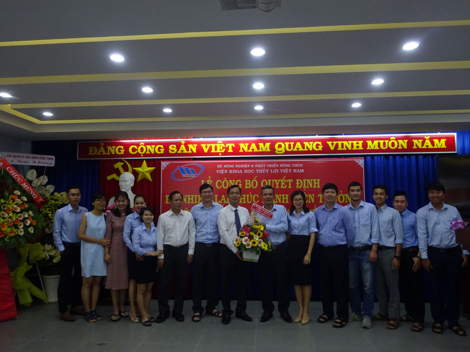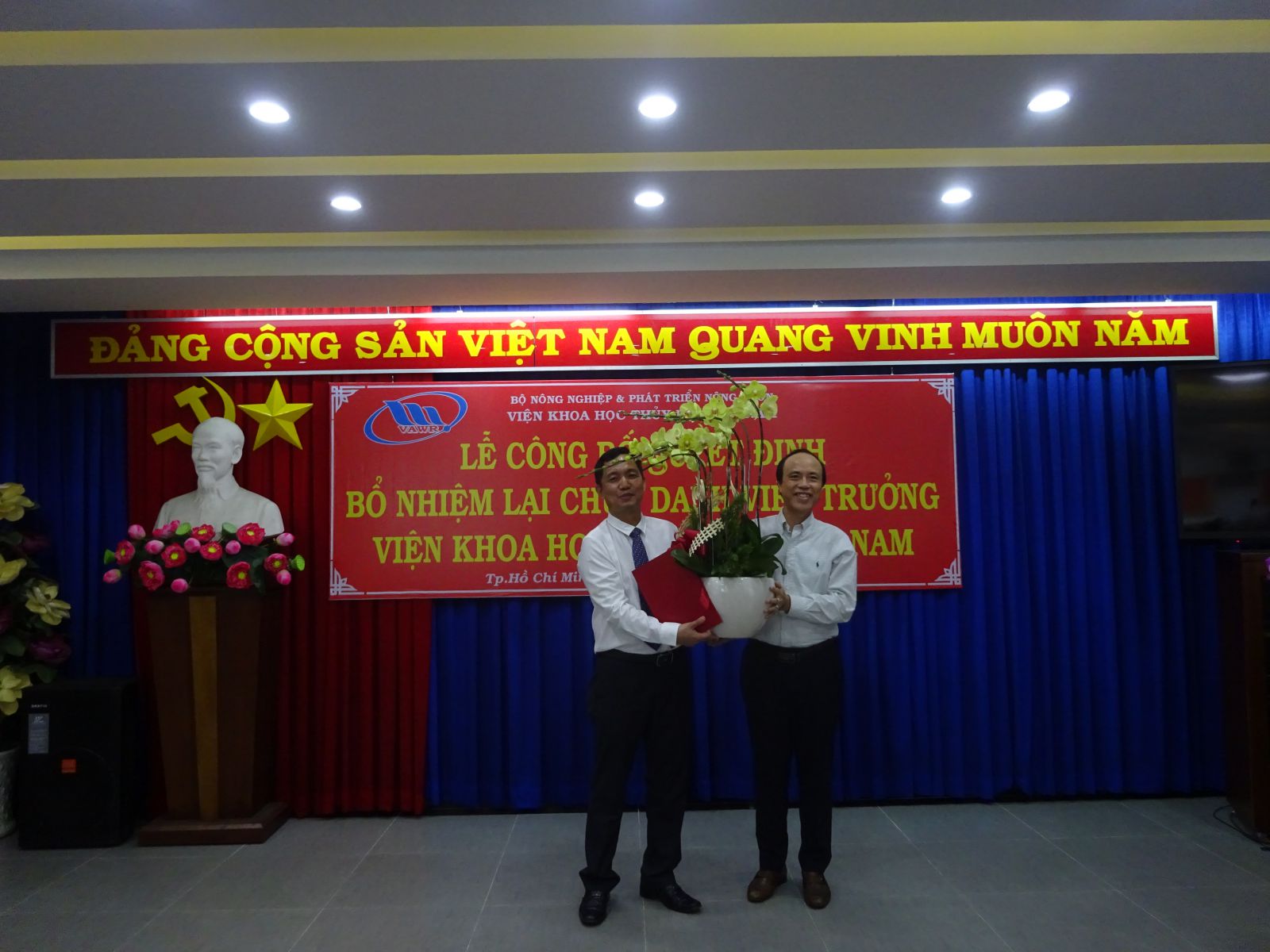 Tại buổi lễ, ThS. Nguyễn Thu Trang - Phó Trưởng Ban Tổ chức, Hành chính đã công bố Quyết định số 18/QĐ-VKHTLVN ngày 06/01/2020 của Giám đốc Viện Khoa học Thủy lợi Việt Nam về việc bổ nhiệm lại viên chức quản lý đối với PGS.TS. Trần Bá Hoằng Viện trưởng Viện Khoa học Thủy lợi miền Nam. Thời hạn bổ nhiệm là 05 năm kể từ ngày 12/01/2020.