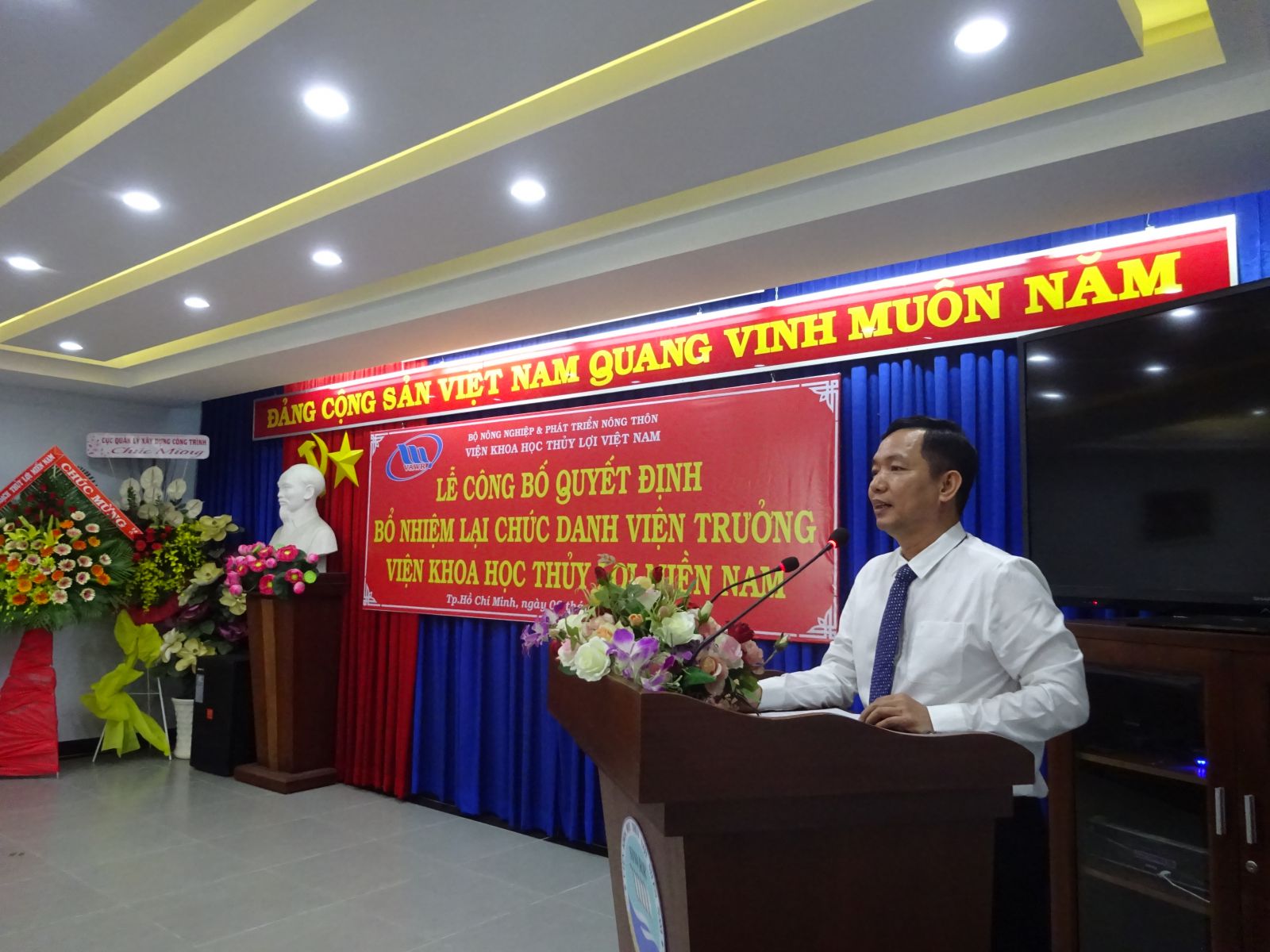Thay mặt Đảng ủy - Lãnh đạo Viện Khoa học Thủy lợi Việt Nam, GS.TS. Nguyễn Vũ Việt - Bí thư Đảng ủy - Giám đốc Viện đã phát biểu giao nhiệm vụ đối với PGS.TS Trần Bá Hoằng khi được bổ nhiệm bổ nhiệm lại giữ chức vụ Viện trưởng Viện Khoa học Thủy lợi miền Nam. Giám đốc Viện đề nghị đồng chí Viện trưởng tiếp tục phát huy những thế mạnh đã được trong nhiệm kỳ vừa qua, để xây dựng Viện Khoa học Thủy lợi miền Nam thành Viện vùng mạnh khu vực phía Nam.