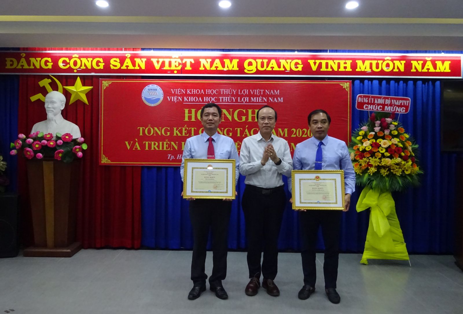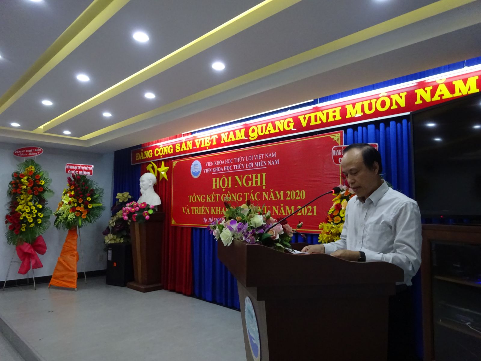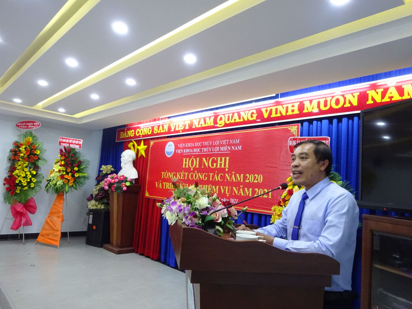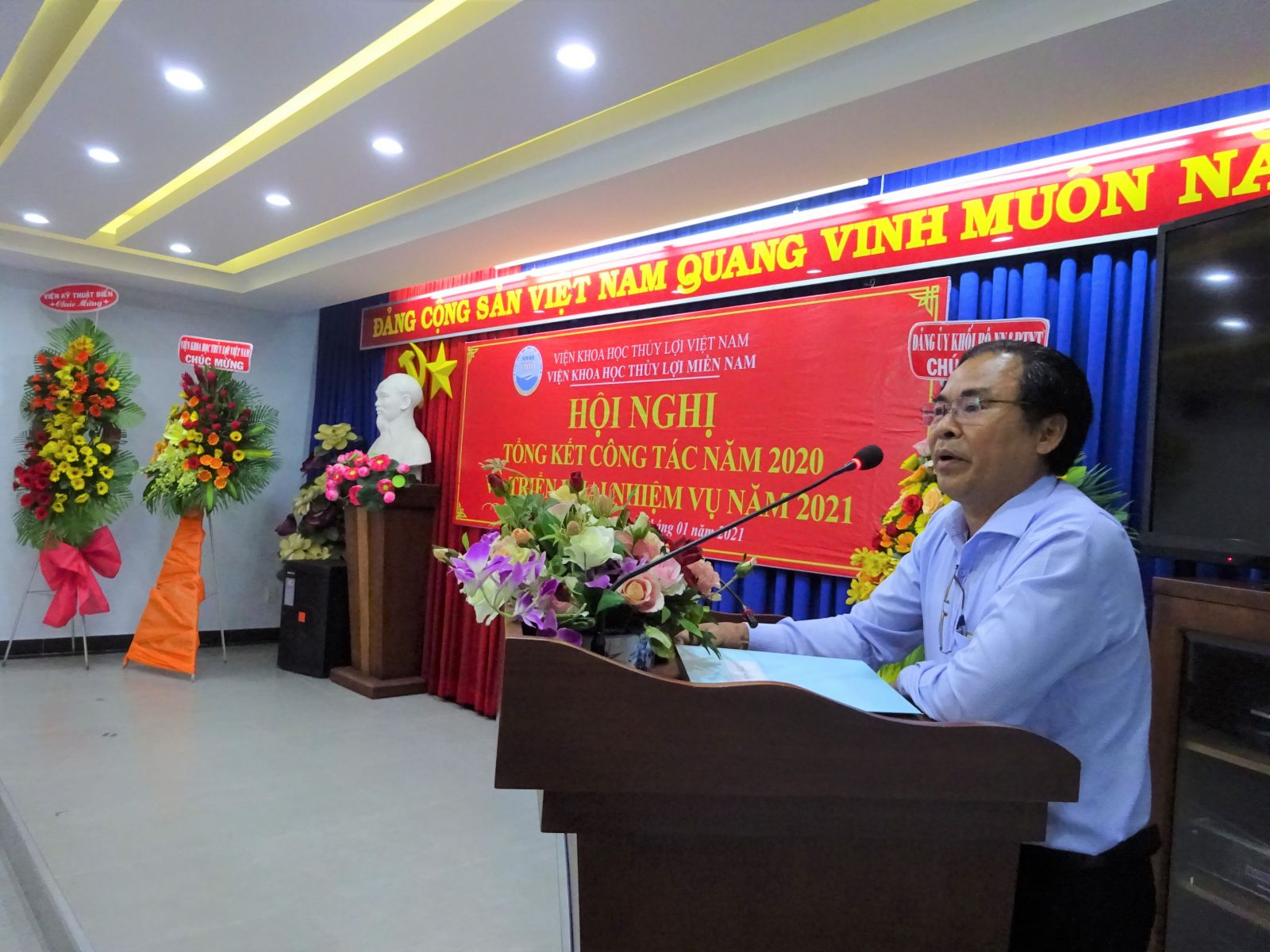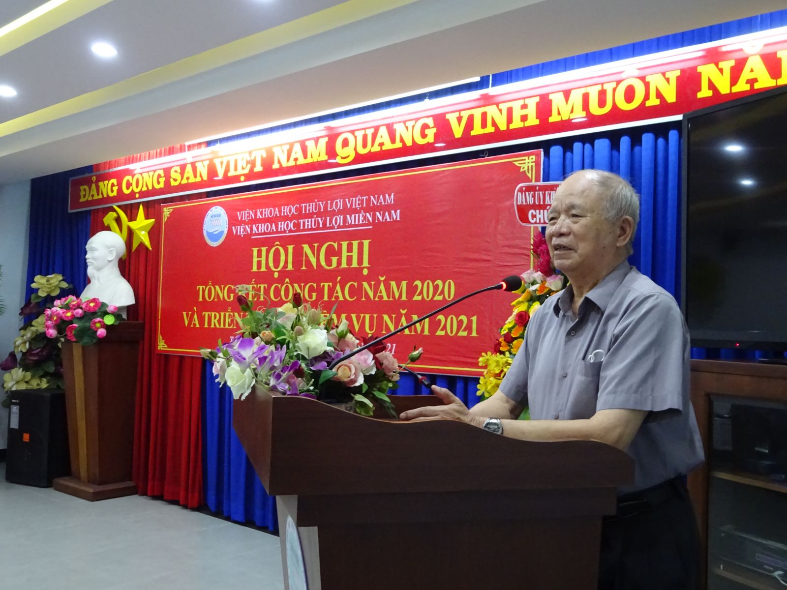 Phát biểu chỉ đạo Hội nghị, ông Vũ Viết Hưng - Phó Bí thư Đảng ủy Khối, Phó Cục trưởng Cục Quản lý xây dựng công trình và GS.TS Nguyễn Vũ Việt – Giám đốc Viện đã biểu dương những cố gắng lớn của tập thể cán bộ viên chức Viện trong năm qua, đặc biệt là những kết quả mà Viện Khoa học Thủy lợi miền Nam đã đạt được trong năm 2020. Giám đốc Viện cũng yêu cầu Viện Khoa học Thủy lợi miền Nam tiếp tục nâng cao năng lực về mọi mặt để thực hiện những nhiệm vụ mới ở giai đoạn 2021 - 2025 do Bộ Nông nghiệp & PTNT và Viện KHTL Việt Nam giao ở phía Nam nhằm thực hiện tốt Nghị quyết 120 của Chính phủ về ĐBSCL.