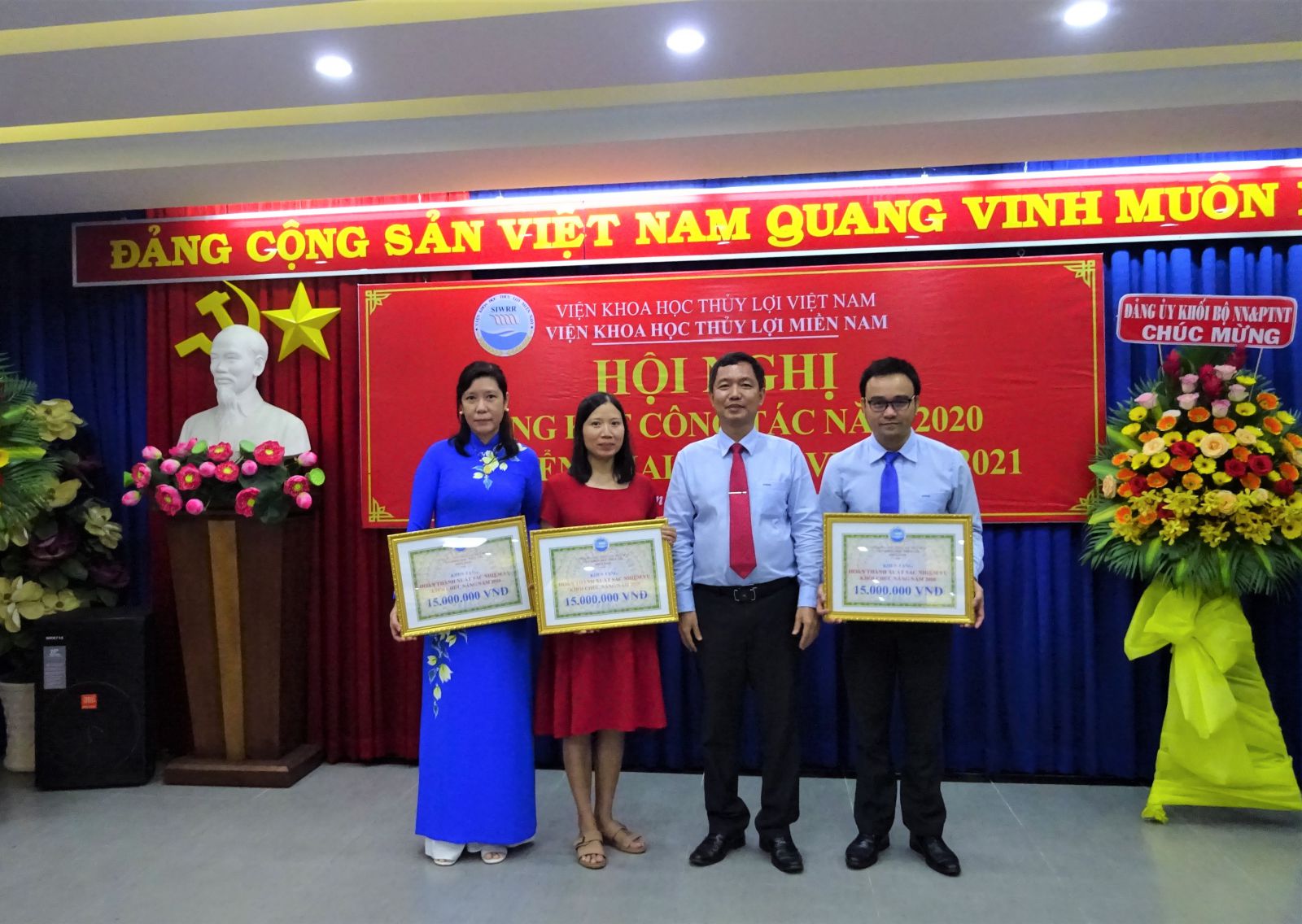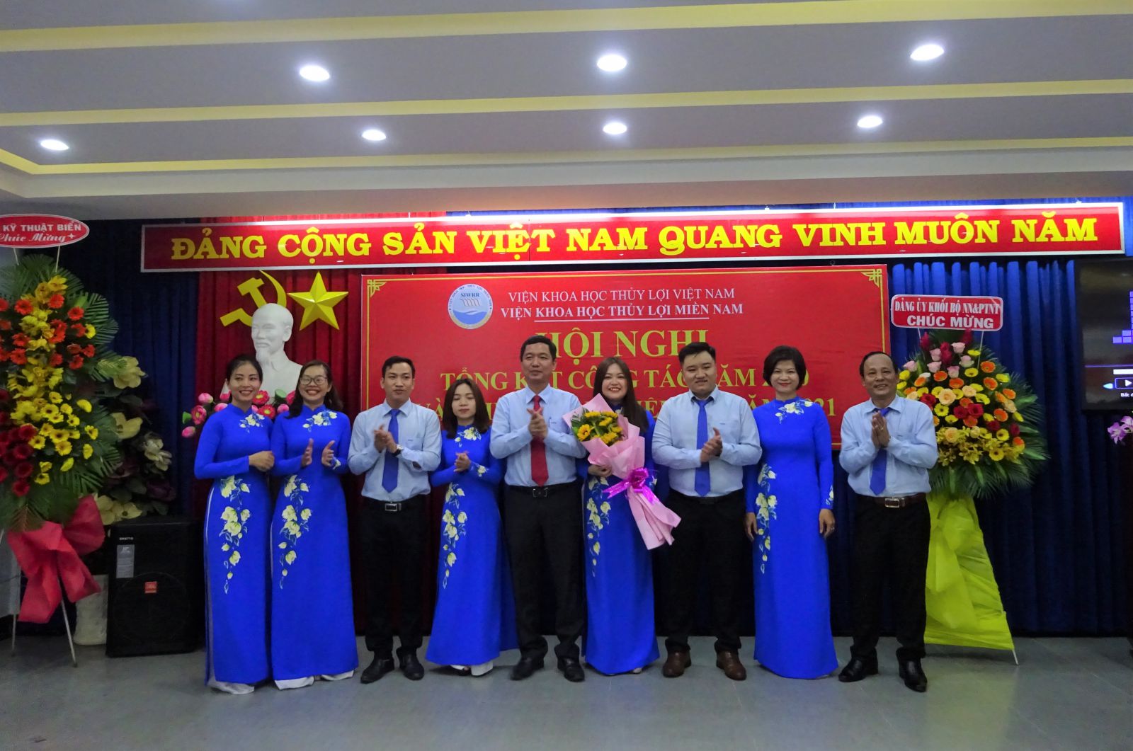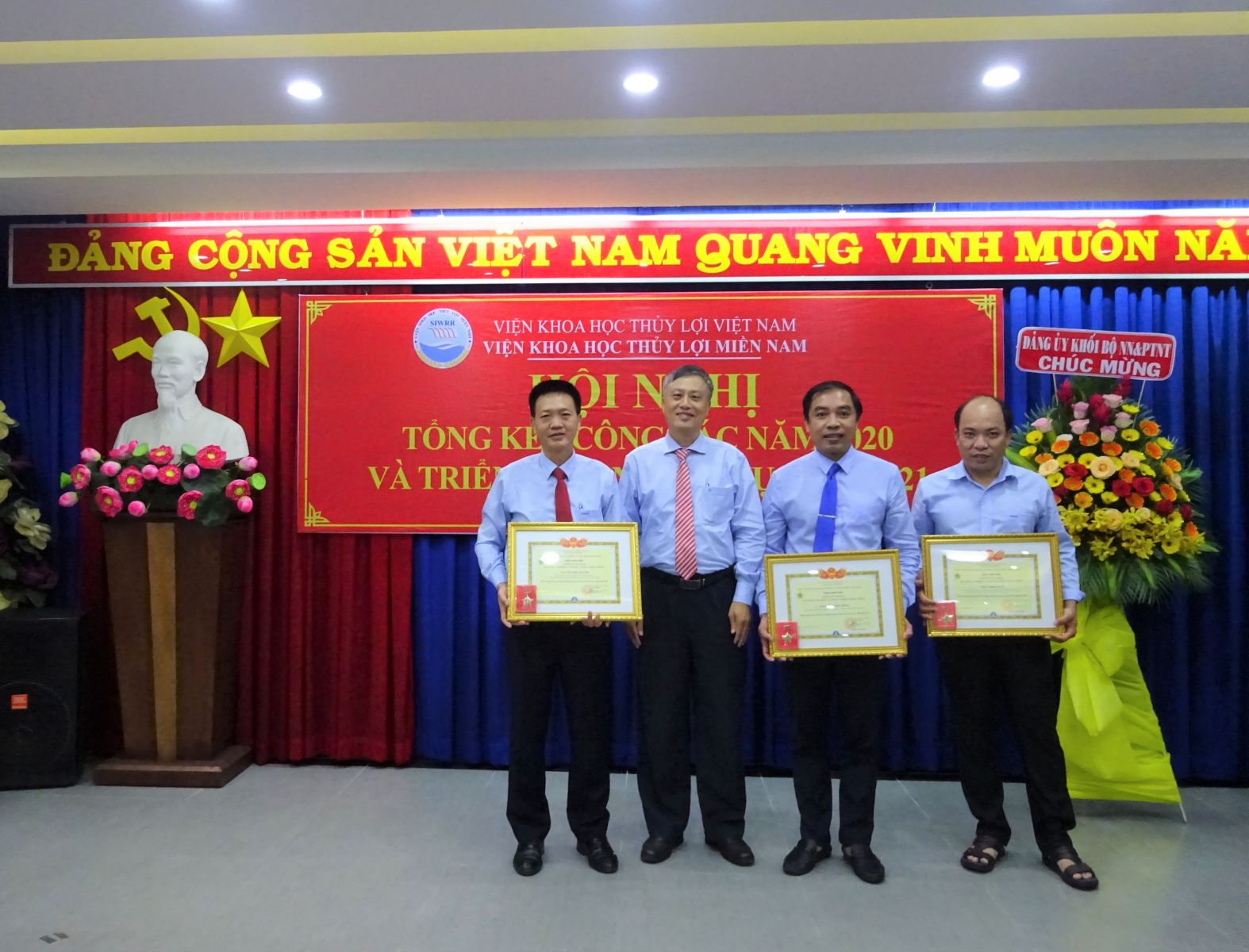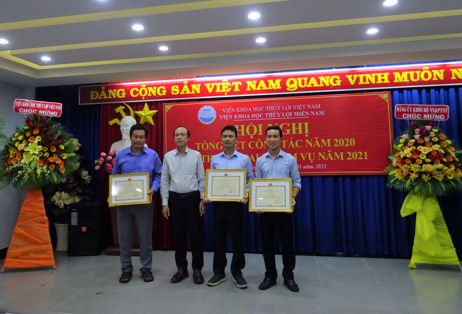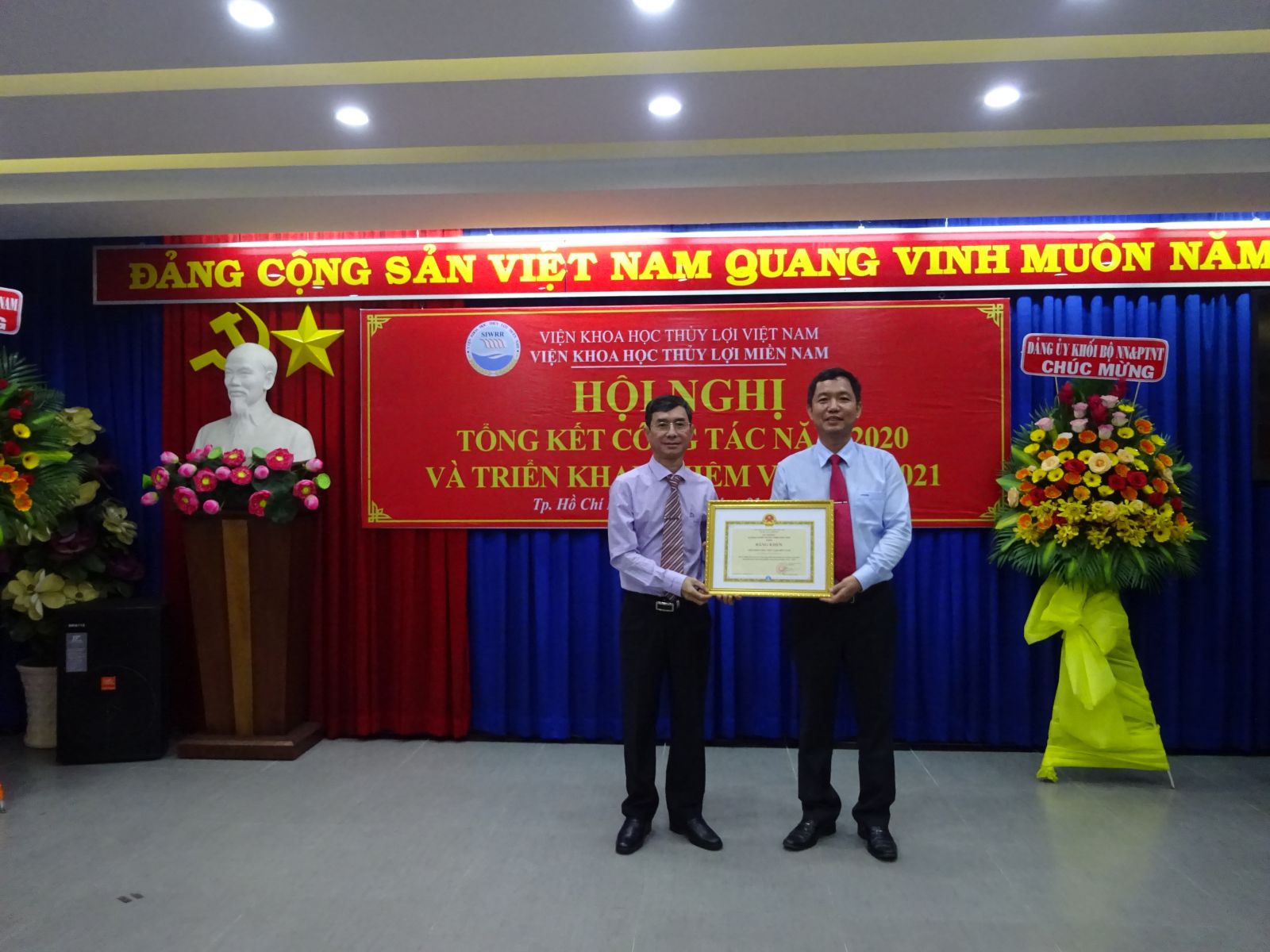 Phát biểu chỉ đạo Hội nghị, ông Vũ Viết Hưng - Phó Bí thư Đảng ủy Khối, Phó Cục trưởng Cục Quản lý xây dựng công trình và GS.TS Nguyễn Vũ Việt – Giám đốc Viện đã biểu dương những cố gắng lớn của tập thể cán bộ viên chức Viện trong năm qua, đặc biệt là những kết quả mà Viện Khoa học Thủy lợi miền Nam đã đạt được trong năm 2020. Giám đốc Viện cũng yêu cầu Viện Khoa học Thủy lợi miền Nam tiếp tục nâng cao năng lực về mọi mặt để thực hiện những nhiệm vụ mới ở giai đoạn 2021 - 2025 do Bộ Nông nghiệp & PTNT và Viện KHTL Việt Nam giao ở phía Nam nhằm thực hiện tốt Nghị quyết 120 của Chính phủ về ĐBSCL.
