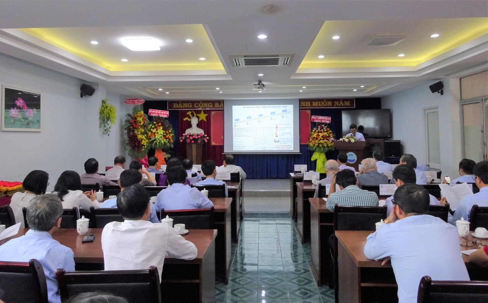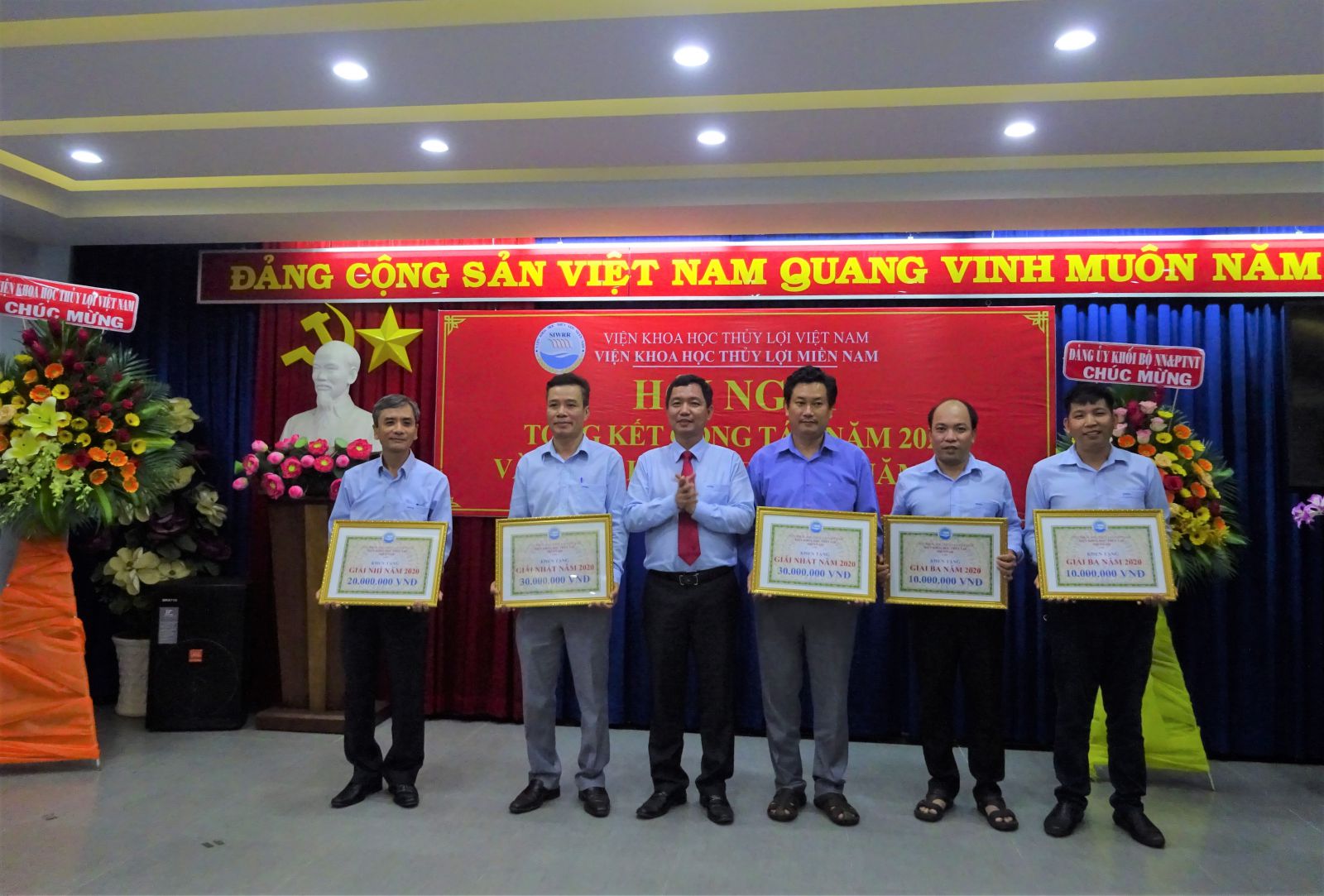 Báo cáo tổng kết công tác của Viện do Viện trưởng Trần Bá Hoằng trình bày cho biết năm 2020, tập thể cán bộ viên chức Viện Khoa học Thủy lợi miền Nam đã thực hiện tổng cộng hơn 30 đề tài, dự án các cấp (đề tài cấp Nhà nước: 14; đề tài cấp Bộ:04; Đề tài cấp tỉnh: 06; nhiệm vụ đặc thù gồm điều tra cơ bản trong các lĩnh vực giám sát xâm nhập mặn, dự báo nguồn nước, dự báo chất lượng nước cho các lưu vực sông và giám sát hiện trạng sạt lở bờ sông, bở biển vùng đồng bằng sông Cửu Long: 07 nhiệm vụ; 1 đề tài thuộc quỹ Nafosted; 5 nhiệm vụ thường xuyên theo chức năng).