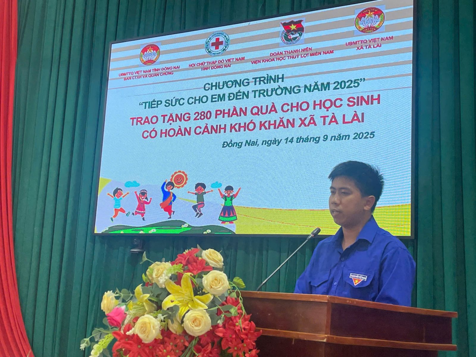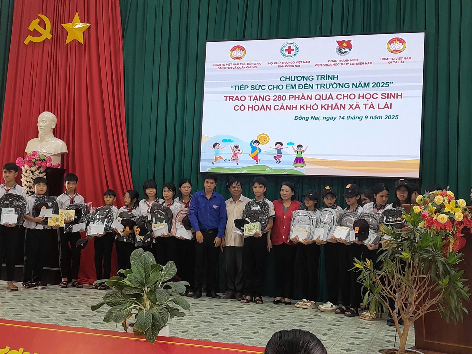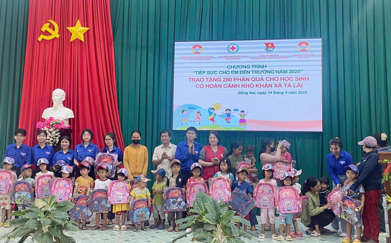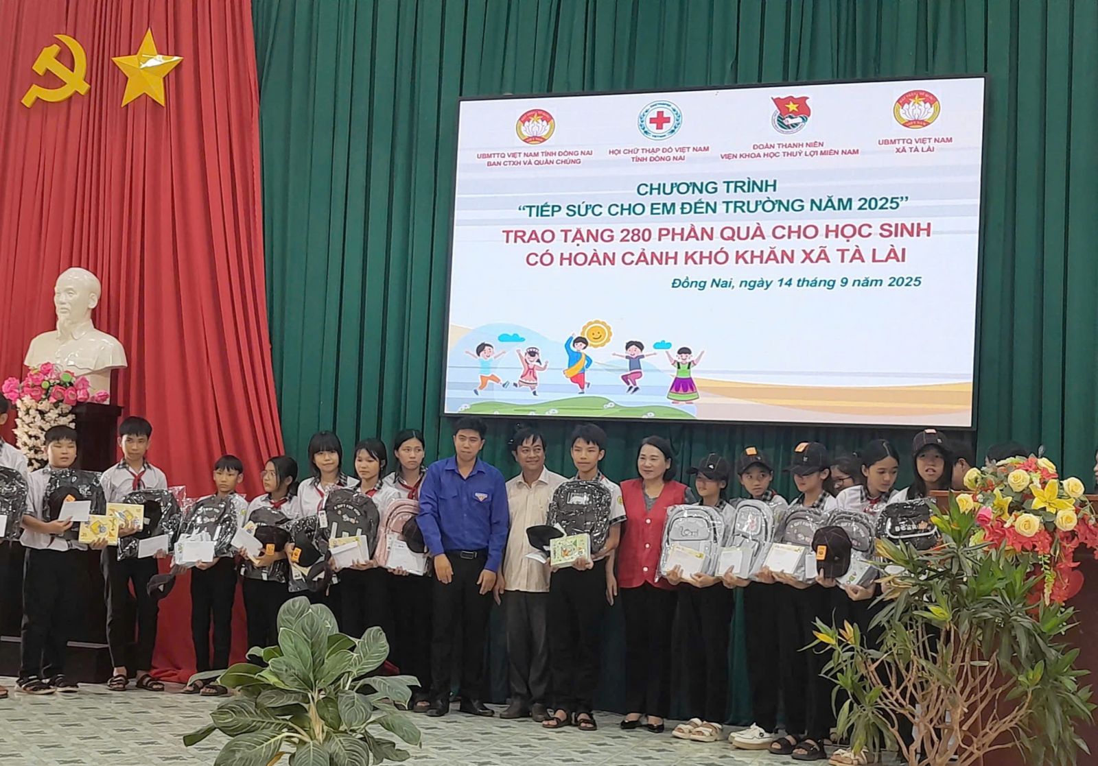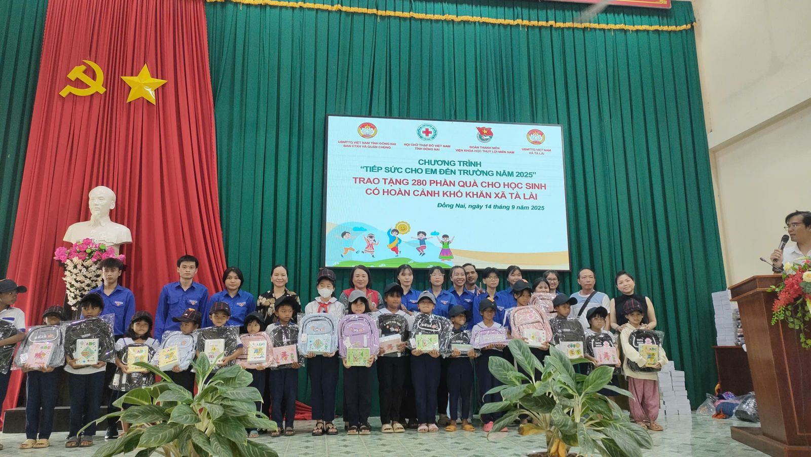 Trong Chương trình Đoàn Thanh niên Viện đã vận động nguồn lực phối hợp cùng các đơn vị tặng 280 phần quà, học bổng đến các em học sinh có hoàn cảnh khó khăn trên địa bàn xã Tà Lài, tỉnh Đồng Nai: