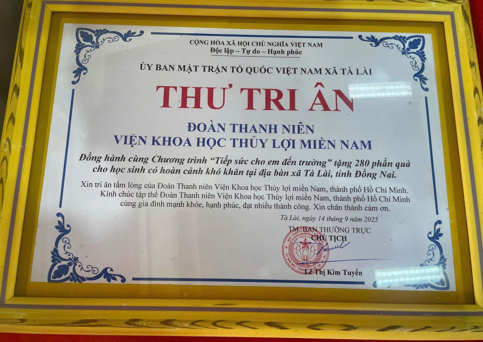 - Tổng giá trị thực hiện chương trình khoảng 80 triệu đồng. Những phần quà tuy giá trị không cao nhưng chứa đựng tình cảm của Đoàn viên, Thanh niên Viện Khoa học Thủy lợi miền Nam và các Nhà hảo tâm gửi đến các em học sinh có hoàn cảnh khó khăn để động viên tinh thần các em cố gắng vươn lên trong học tập.